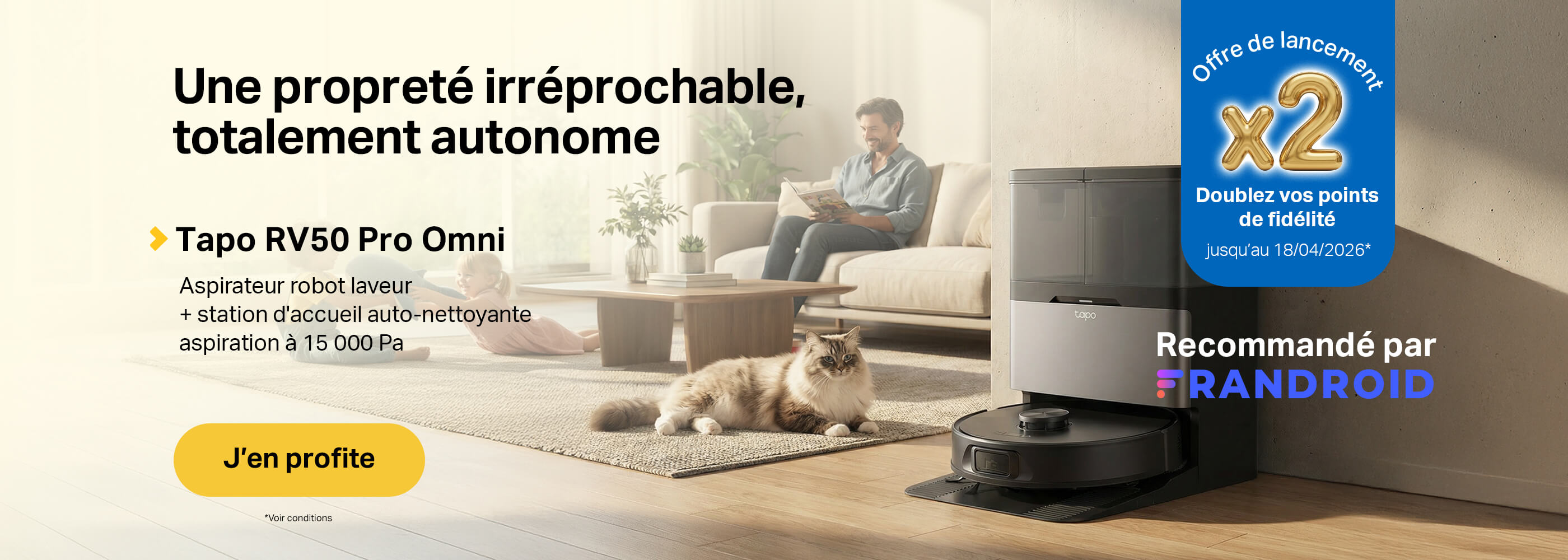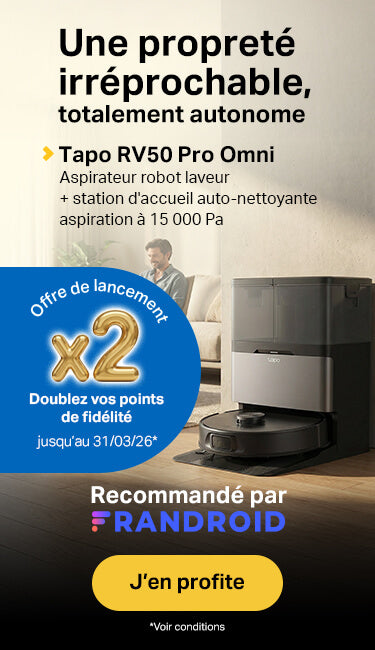 Offre exclusive valable uniquement sur le site https://fr.store.tapo.com/, jusqu’au 18 mars 2026 à minuit. Offre non cumulable avec toute autre offre ou opération commerciale en cours et hors frais de livraison. Doublement des points du programme de fidélité applicable uniquement sur l’aspirateur robot Tapo RV50 Pro Omni, dans la limite des stocks disponibles. Points crédités après validation définitive de la commande et applicables une seule fois par commande.