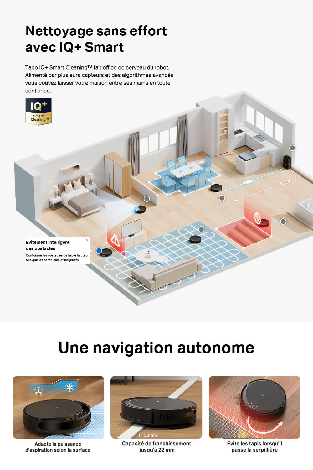 | Fonctionnalités | Conception ultra-fine (83 mm), technologie DeepVac (>97 % de taux de collecte de poussière), algorithmes de nettoyage intelligents (Tapo IQ+), débit d'eau réglable pour le lavage, franchissement d'obstacles jusqu’à 2,2 cm, évitement des collisions | Aspiration, Laveur, Station de vidange automatique, Navigation intelligente LiDAR, Contrôle par application, Contrôle vocal, Modes de nettoyage multiples, Verrouillage enfants/animaux, Cartographie 3D, Programmations personnalisables, Débit d'eau réglable | Aspiration, Nettoyage humide | Aspiration, Lavage, Station de vidage automatique, Cartographie, Programmation, Contrôle vocal, Détection de tapis avec boost |