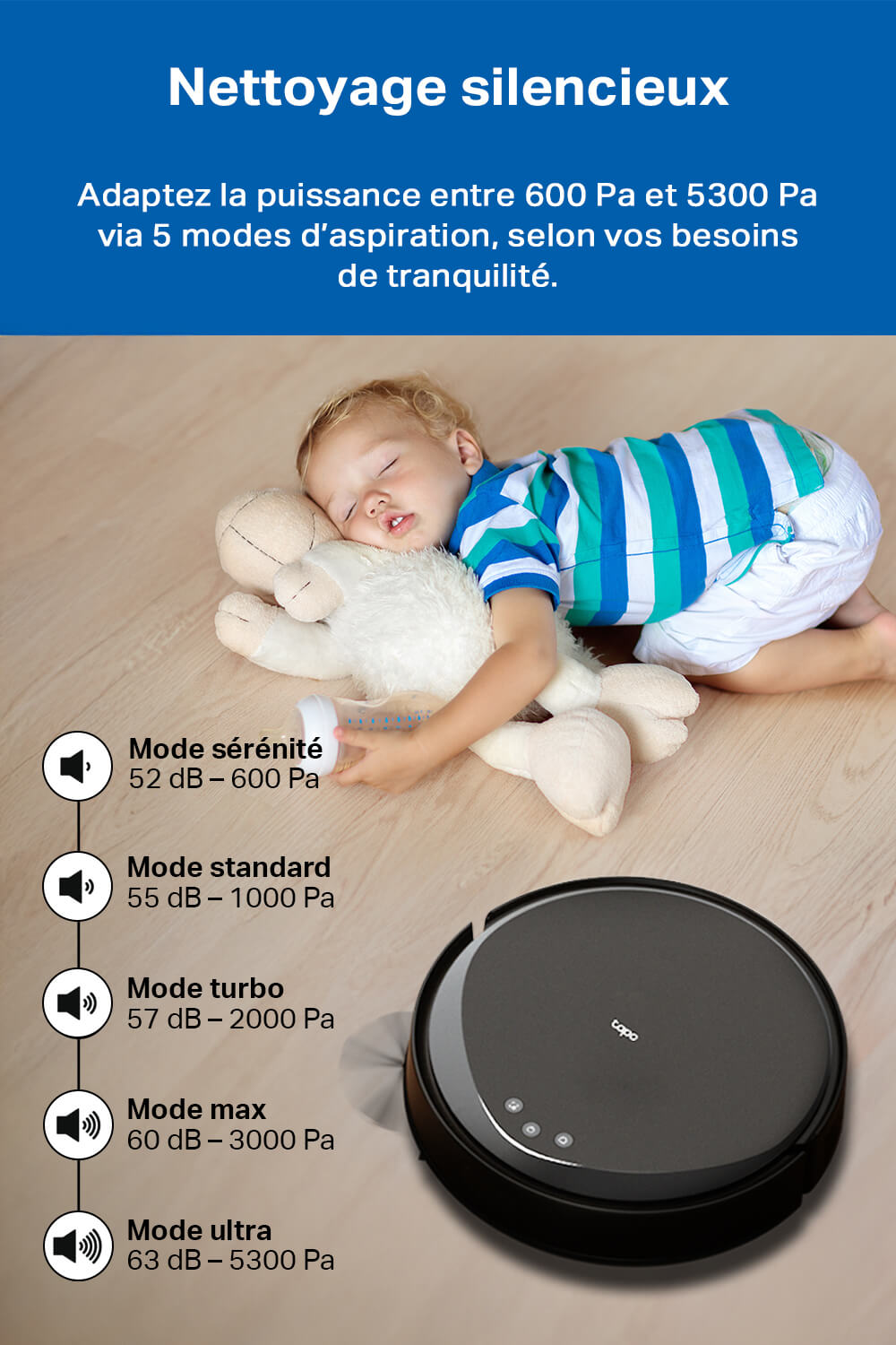 Le Tapo RV20 Max se distingue par sa capacité à s'adapter à différents environnements de nettoyage. Avec cinq niveaux de puissance d'aspiration réglables, il peut facilement passer de la moquette aux sols durs, en ajustant automatiquement sa puissance pour une efficacité optimale. Sa technologie DeepVac™ garantit un taux d'aspiration supérieur à 97%, assurant que même les particules les plus fines sont capturées.