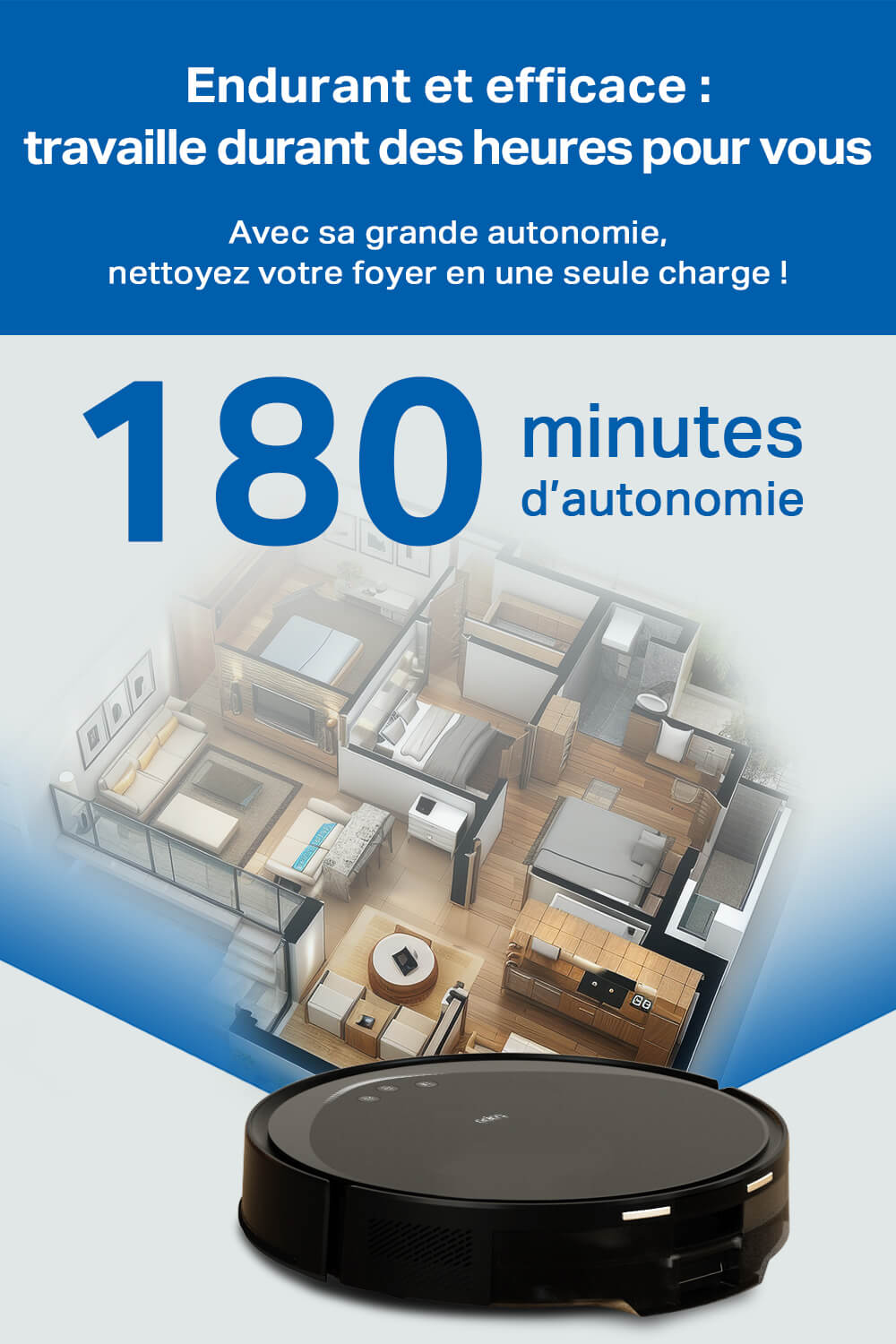 La batterie lithium-ion de 2600 mAh offre jusqu'à 180 minutes d'autonomie. L'appareil retourne automatiquement à sa station de charge lorsque nécessaire. -
