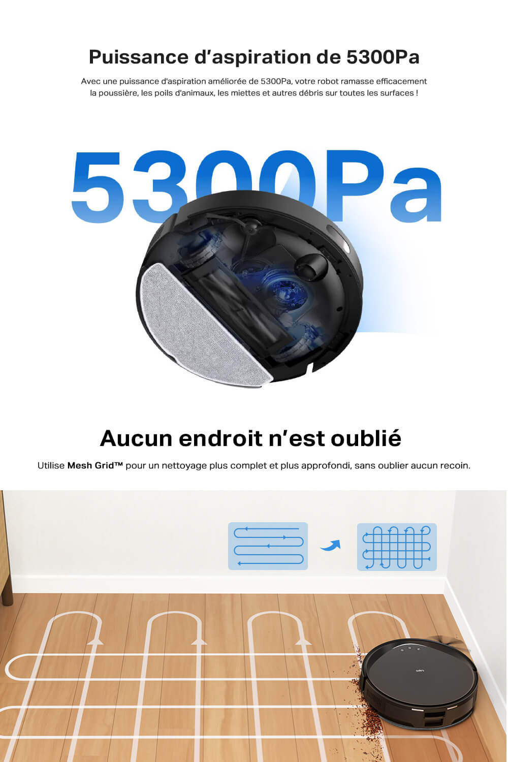 | Fonctionnalités de l'aspirateur robot | Navigation LiDAR MagSlim™, nettoyage Mesh Grid™, évitement des tapis en mode lavage, détection intelligente des tapis, retour automatique à la base et reprise, commande vocale via Alexa et Google Assistant, cartographie 3D de la maison, programmation et zones de nettoyage personnalisables | Navigation intelligente LiDAR, Retour automatique à la base, Contrôle par application, Programmations personnalisables, Création d'une vue 3D du domicile, Débit d'eau réglable, Évitement des obstacles, Station de vidange automatique, Contrôle vocal | Navigation intelligente LiDAR+IMU, Retour automatique à la base, Compatible Alexa et Google Assistant, Planification personnalisée, Nettoyage par zone/pièce, Zones interdites, Réglages spécifiques tapis, Détection obstacles et seuils 22 mm | |