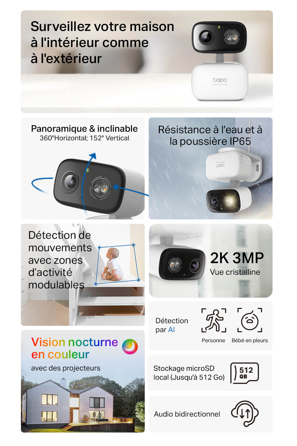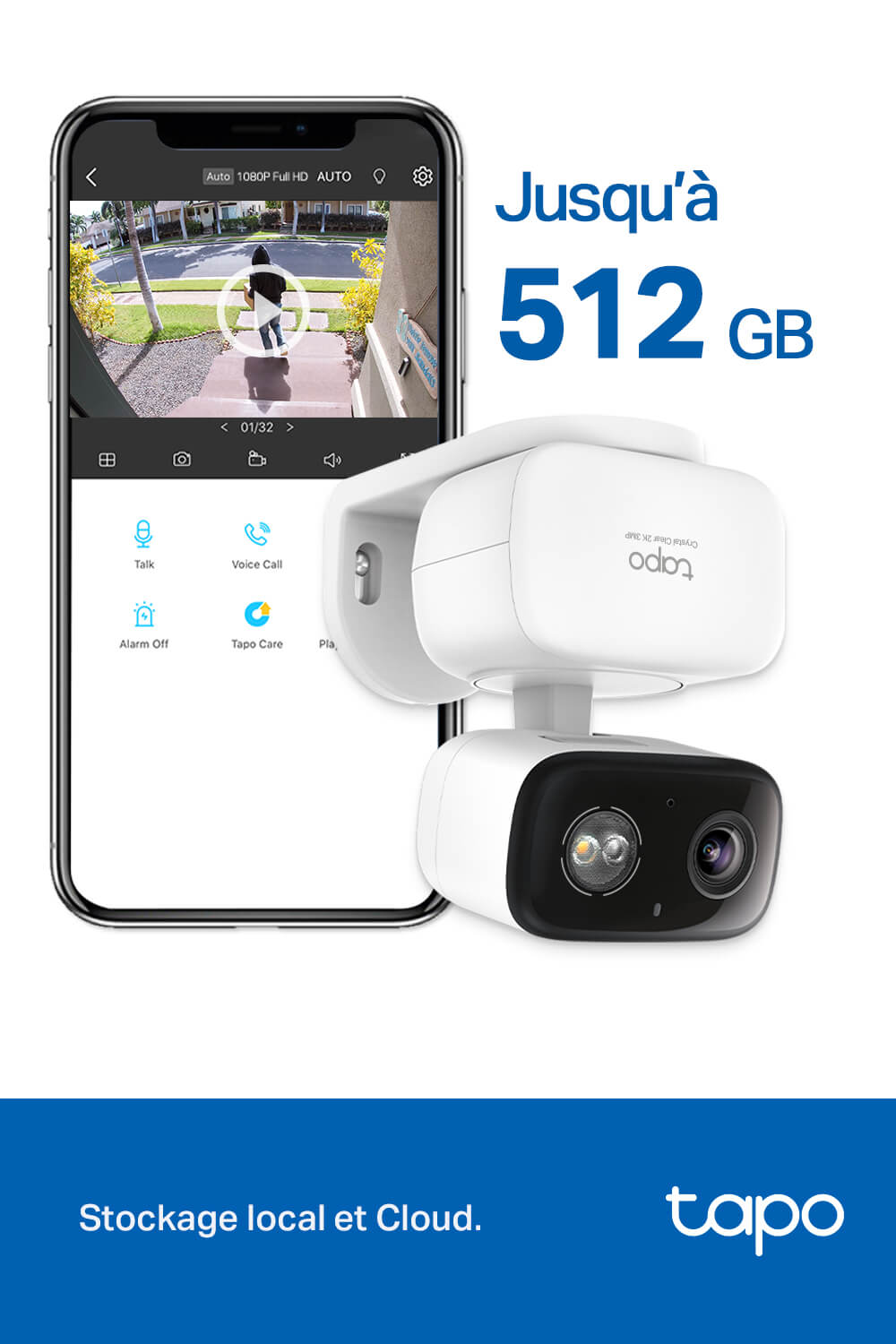 - Options de stockage flexibles – Supporte jusqu'à 512 Go en microSD et stockage cloud Tapo Care