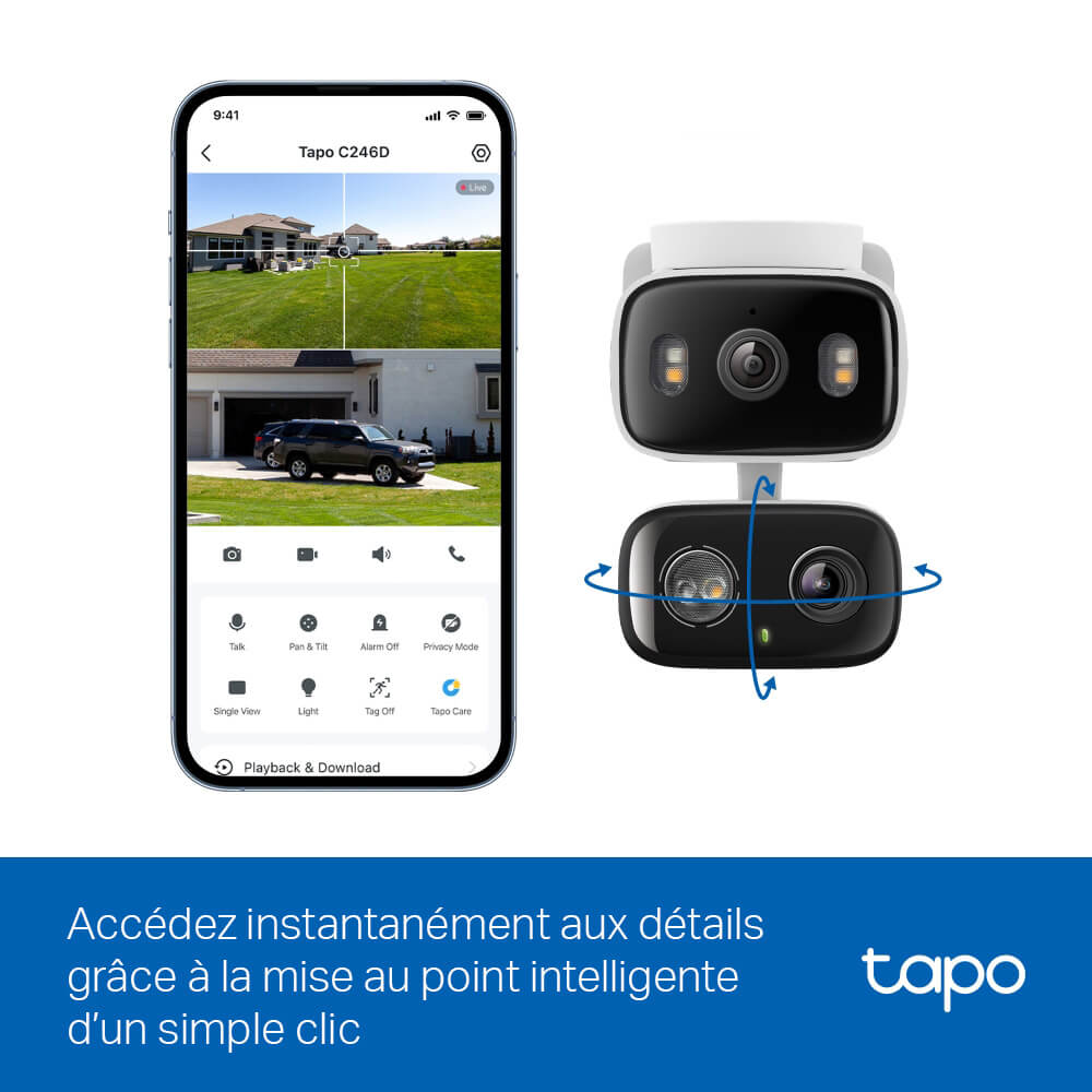 La caméra de surveillance Tapo C246D révolutionne la sécurité domestique avec sa technologie double objectif. Alliant un grand-angle fixe de 125° et un téléobjectif motorisé, elle offre une couverture complète et un suivi détaillé en qualité 2K.