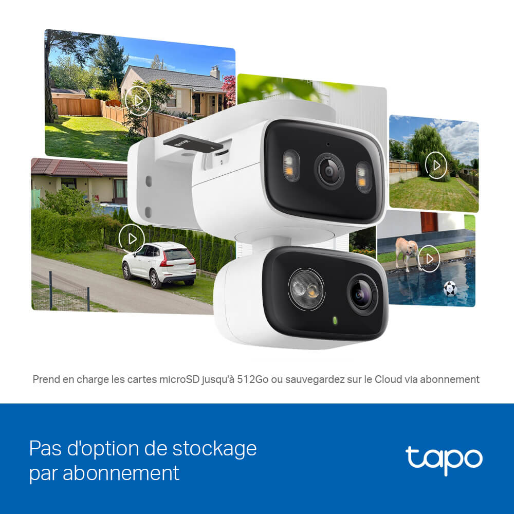 Vous pouvez utiliser une carte microSD jusqu'à 512 Go pour le stockage local, ou opter pour le stockage cloud via un abonnement Tapo Care. -