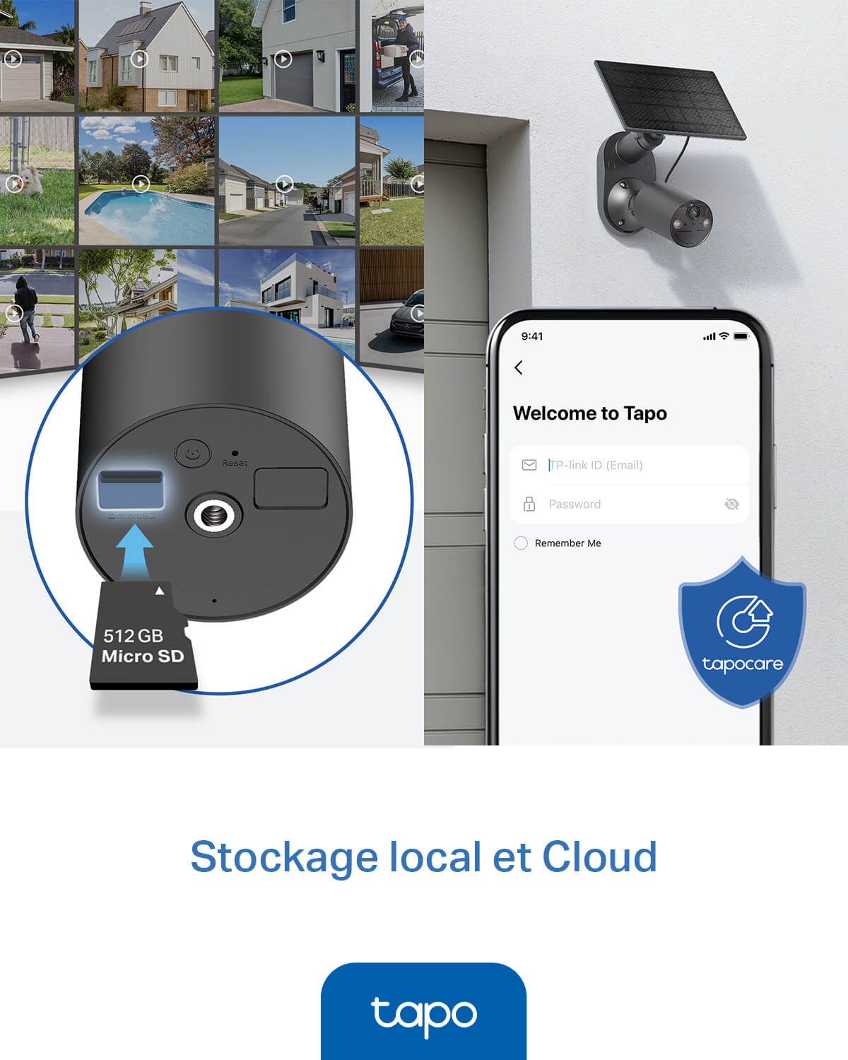 Vous pouvez stocker les enregistrements sur une carte microSD jusqu'à 512 Go ou utiliser le service cloud Tapo Care pour des sauvegardes cryptées et un historique vidéo de 30 jours. -
