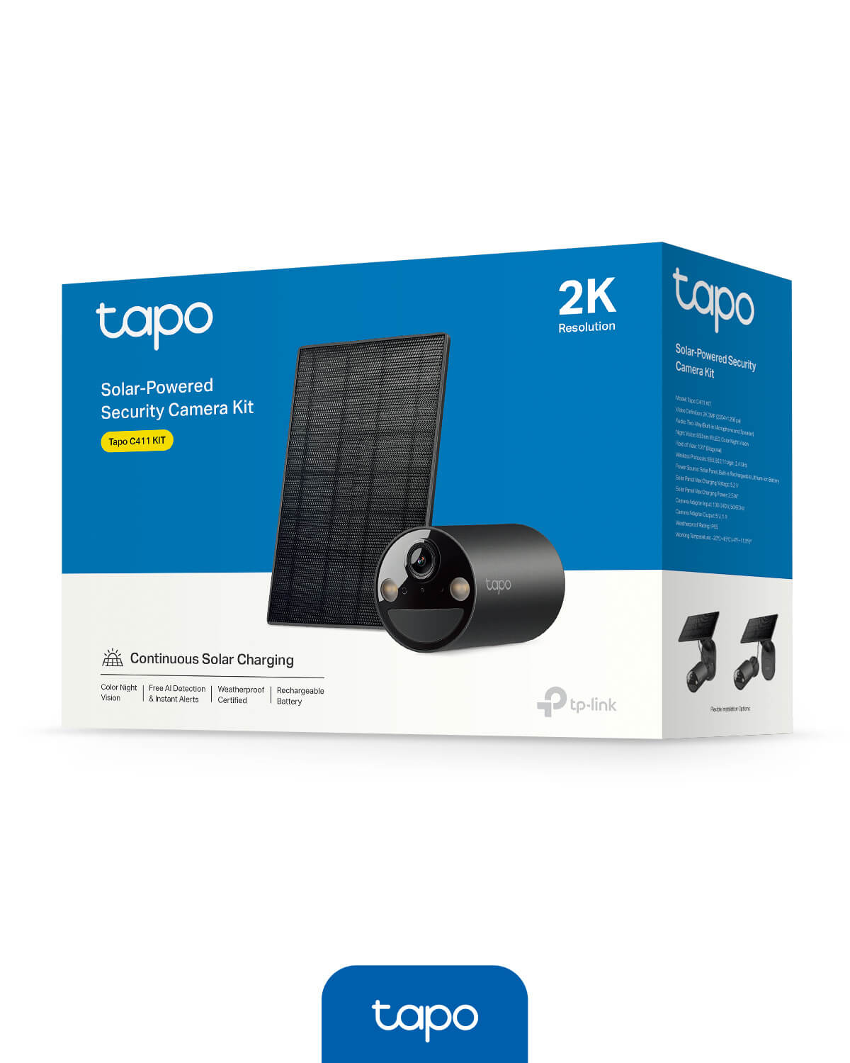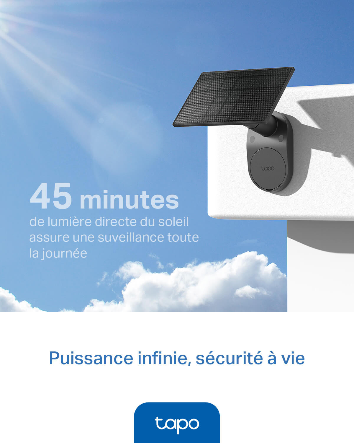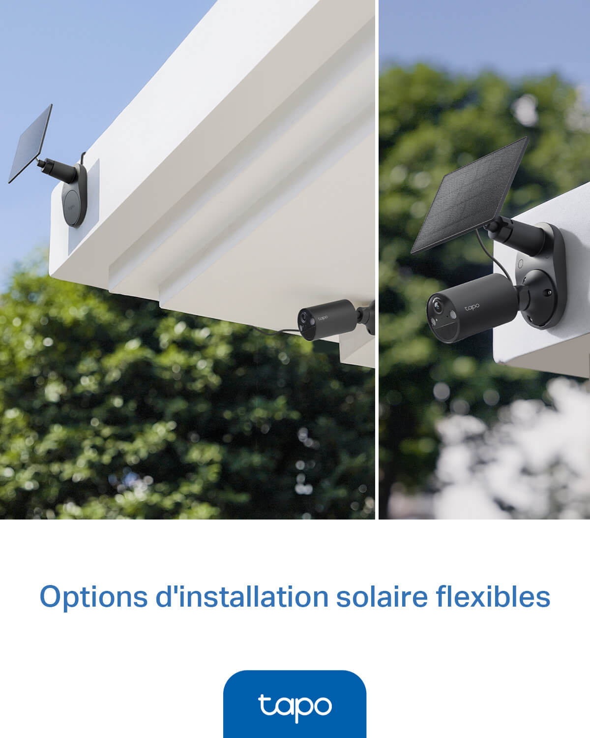 Le Tapo C411 KIT est un kit de caméra de surveillance extérieure sans fil alimenté par l'énergie solaire, conçu pour garantir une surveillance continue et écologique de votre propriété. Il inclut une caméra haute résolution 2K (3MP) offrant des images nettes, un large champ de vision de 125°, ainsi qu'une vision nocturne en couleurs jusqu'à 9 mètres grâce à deux projecteurs intégrés et une LED infrarouge. Adaptée à tous les temps grâce à la certification IP65, la caméra fonctionne de -20 à 45°C et s'installe facilement sans besoin de câblage grâce à son panneau solaire à angle ajustable, capable de fournir jusqu'à 180 jours d'autonomie sur une seule charge complète. Elle propose la détection intelligente de personnes, animaux ou véhicules, des zones d'activité personnalisables, un système d'alertes intelligentes sur smartphone, ainsi qu'une compatibilité avec Alexa et Google Assistant pour la commande vocale. L'audio bidirectionnel avec réduction du bruit facilite l'interaction à distance. L'enregistrement vidéo peut se faire soit sur carte microSD (jusqu'à 512 Go), soit dans le cloud via le service Tapo Care. Ce kit s'adresse aux utilisateurs recherchant une surveillance extérieure performante, facile à installer, sans maintenance et respectueuse de l'environnement.