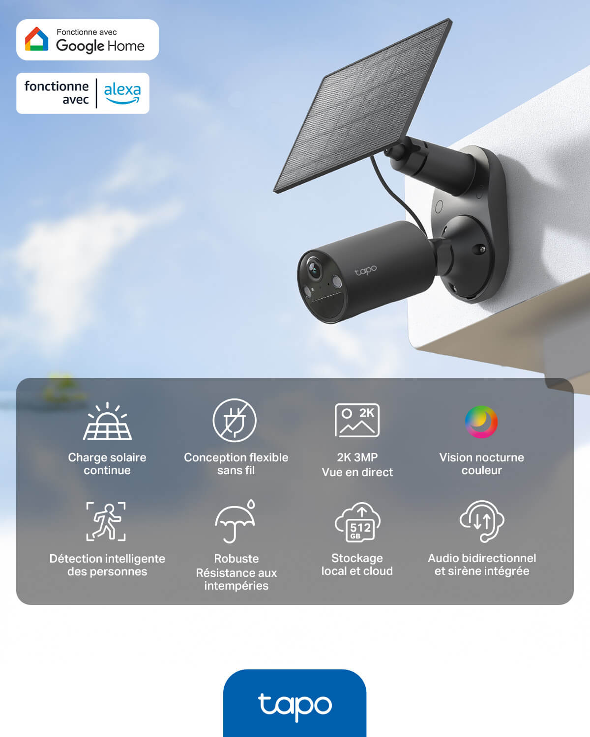 - Caméra haute résolution 2K (3MP) pour des images nettes et détaillées - Champ de vision large de 125° couvrant de vastes zones - Vision nocturne en couleur jusqu'à 9 mètres avec projecteurs intégrés - Détection IA des personnes, animaux et véhicules - Panneau solaire offrant jusqu'à 180 jours d'autonomie - Résistance aux intempéries IP65, fonctionnement de -20°C à 45°C - Audio bidirectionnel avec réduction du bruit - Stockage sur carte microSD (jusqu'à 512 Go) ou cloud via Tapo Care - Compatibilité avec Alexa et Google Assistant pour contrôle vocal