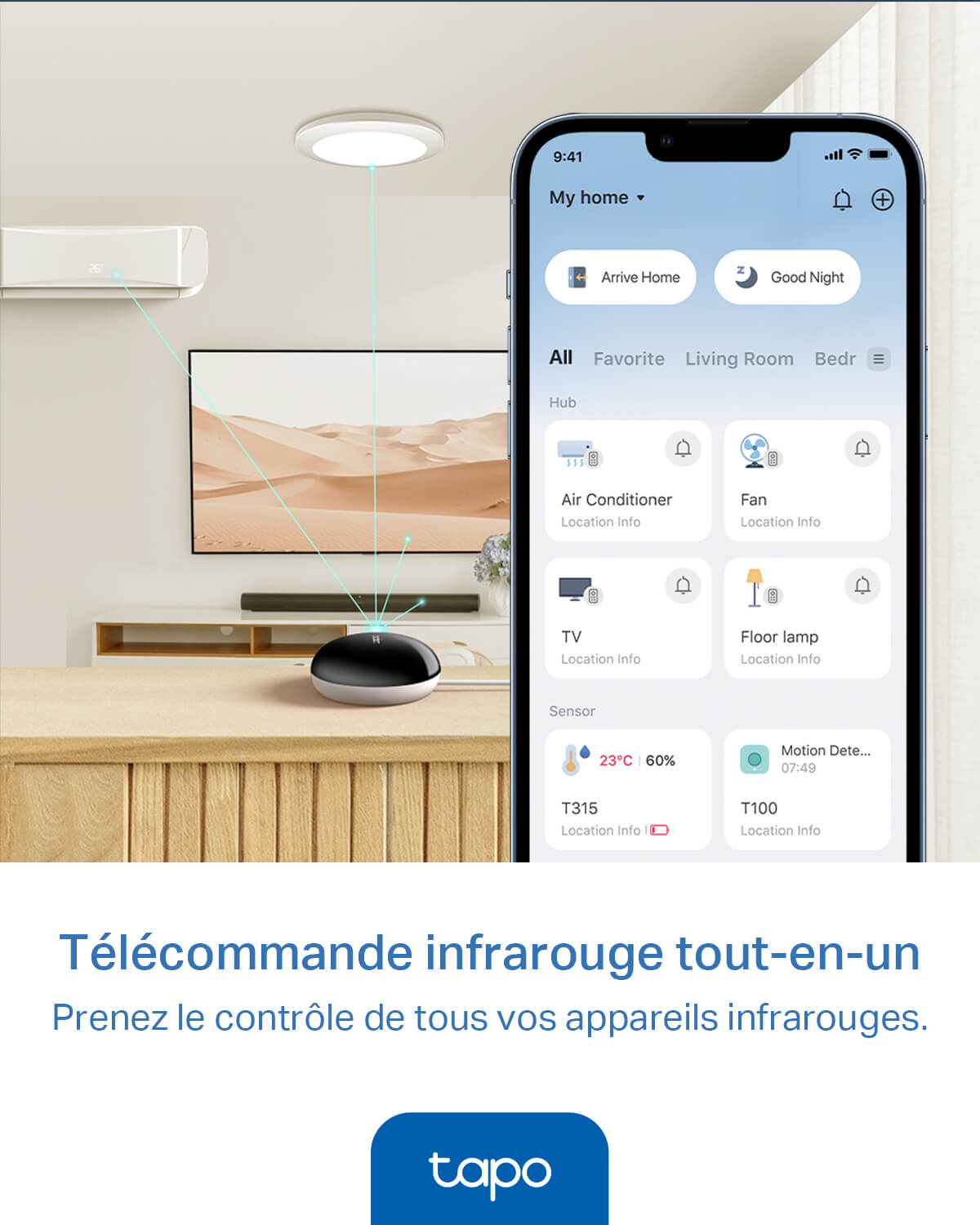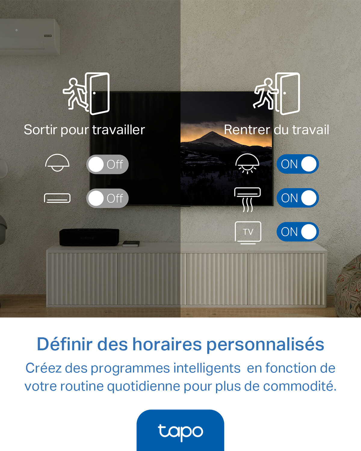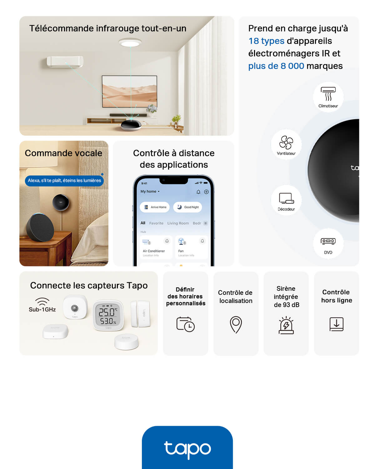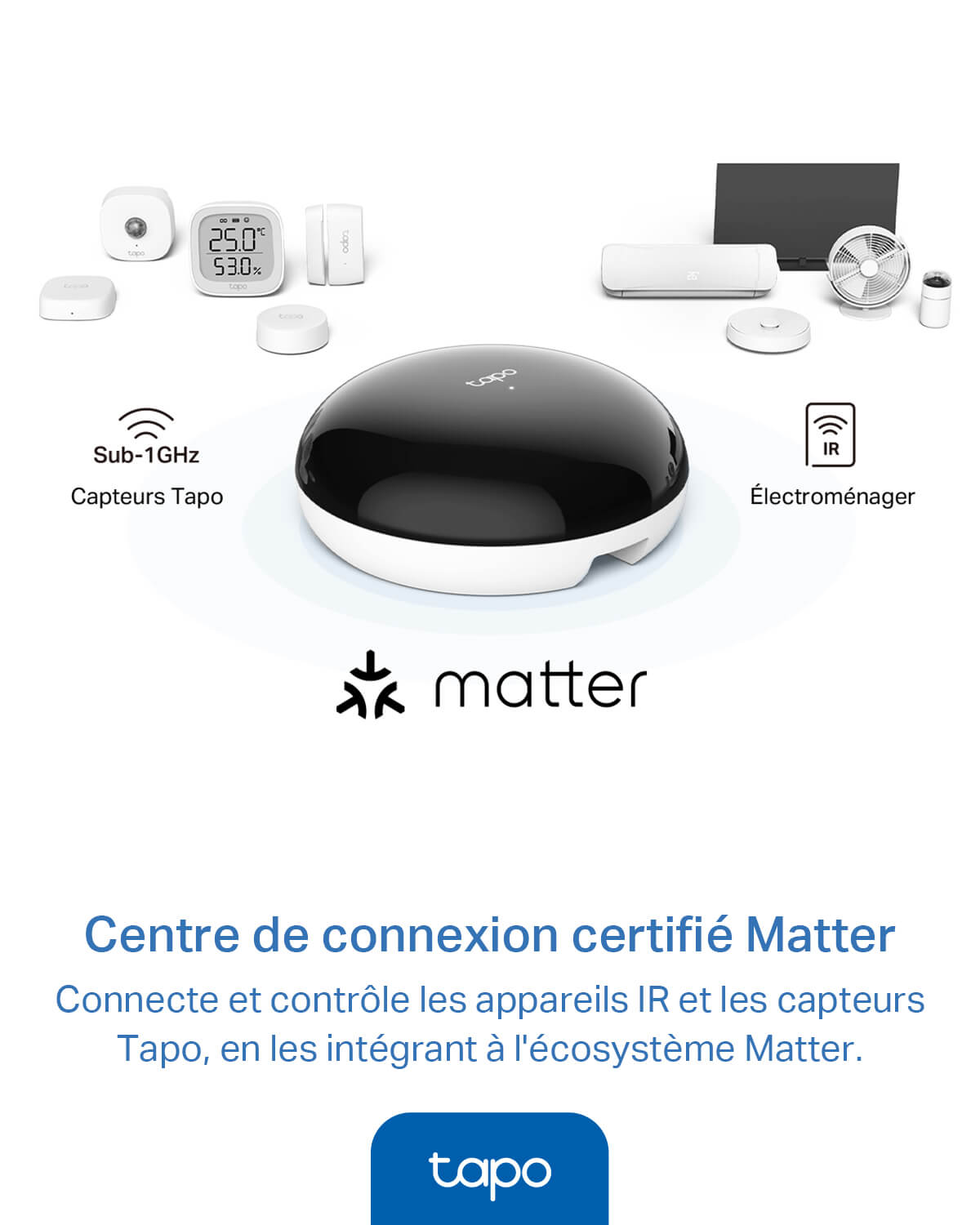 | Fonctionnalités | Contrôle universel IR pour appareils électroménagers infrarouges (plus de 8 000 marques et 18 types d’appareils), Contrôle à distance via application mobile, Commande vocale compatible Siri, Alexa, Google Assistant, Programmation horaire et contrôle de localisation (géorepérage), Compatibilité avec le protocole Matter, Prise en charge des capteurs Tapo supplémentaires (température, humidité, mouvement etc.) via Sub-1 GHz |