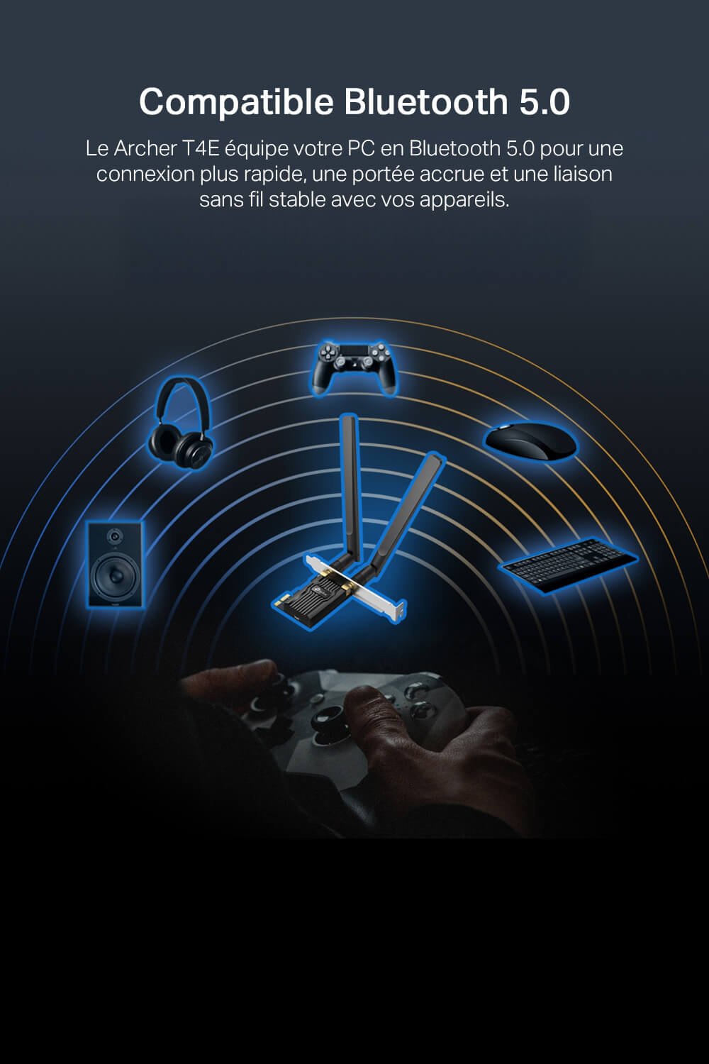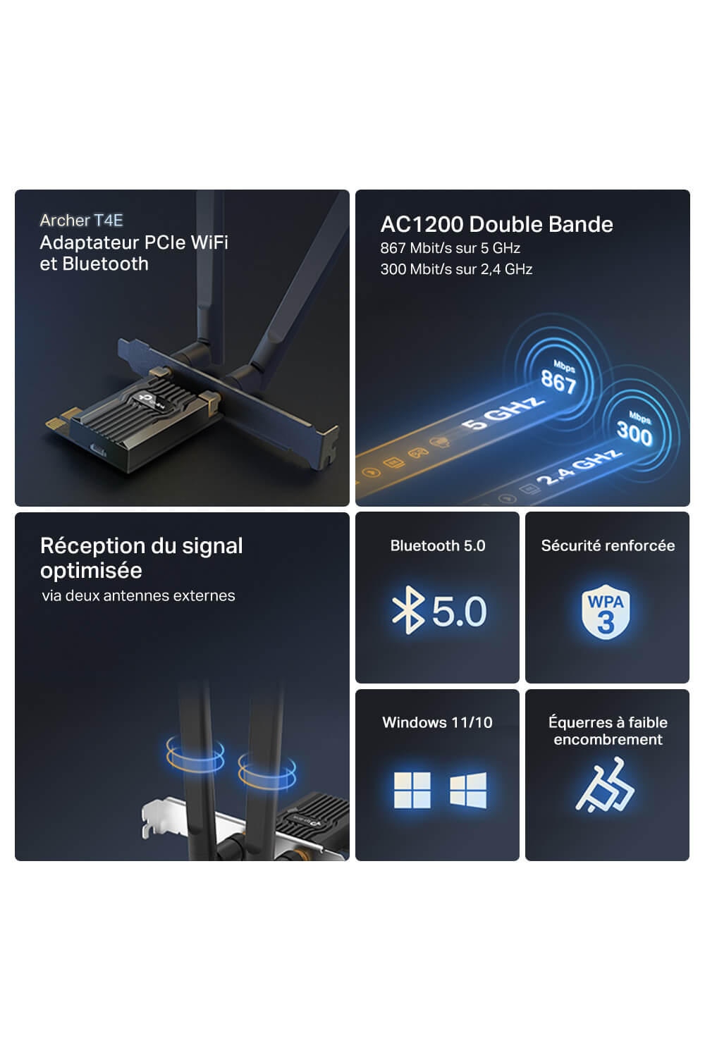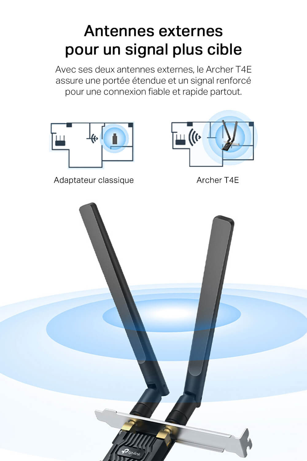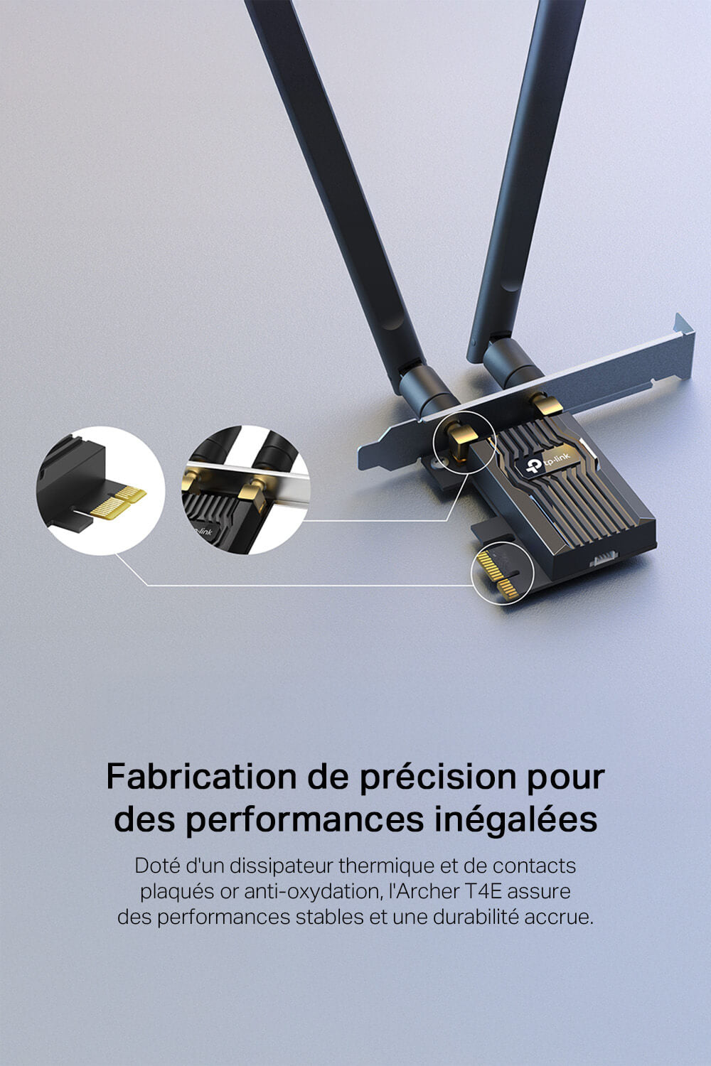 Une installation simple pour des performances optimales Conçue pour s'intégrer parfaitement à votre PC via un port PCI Express x1, l'Archer T4E s'adapte à tous les formats de boîtiers grâce à ses équerres standard et low profile incluses. Son dissipateur thermique en alliage d'aluminium assure une stabilité à toute épreuve, vous garantissant des sessions de jeu ou de travail sans interruption.