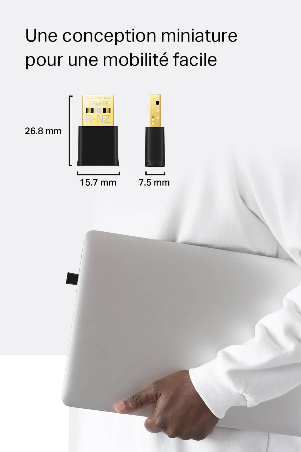 Avec ses dimensions ultra-compactes (26,8 × 15,7 × 7,5 mm) et son poids plume de seulement 3 grammes, la clé USB Wi-Fi Archer TX20U Nano se glisse discrètement sur votre ordinateur portable ou votre PC de bureau. Son format nano vous permet de la laisser branchée en permanence, sans gêne, que ce soit à la maison, au bureau ou en voyage. Plus besoin de la retirer : elle reste en place pour une connexion instantanée à chaque utilisation.