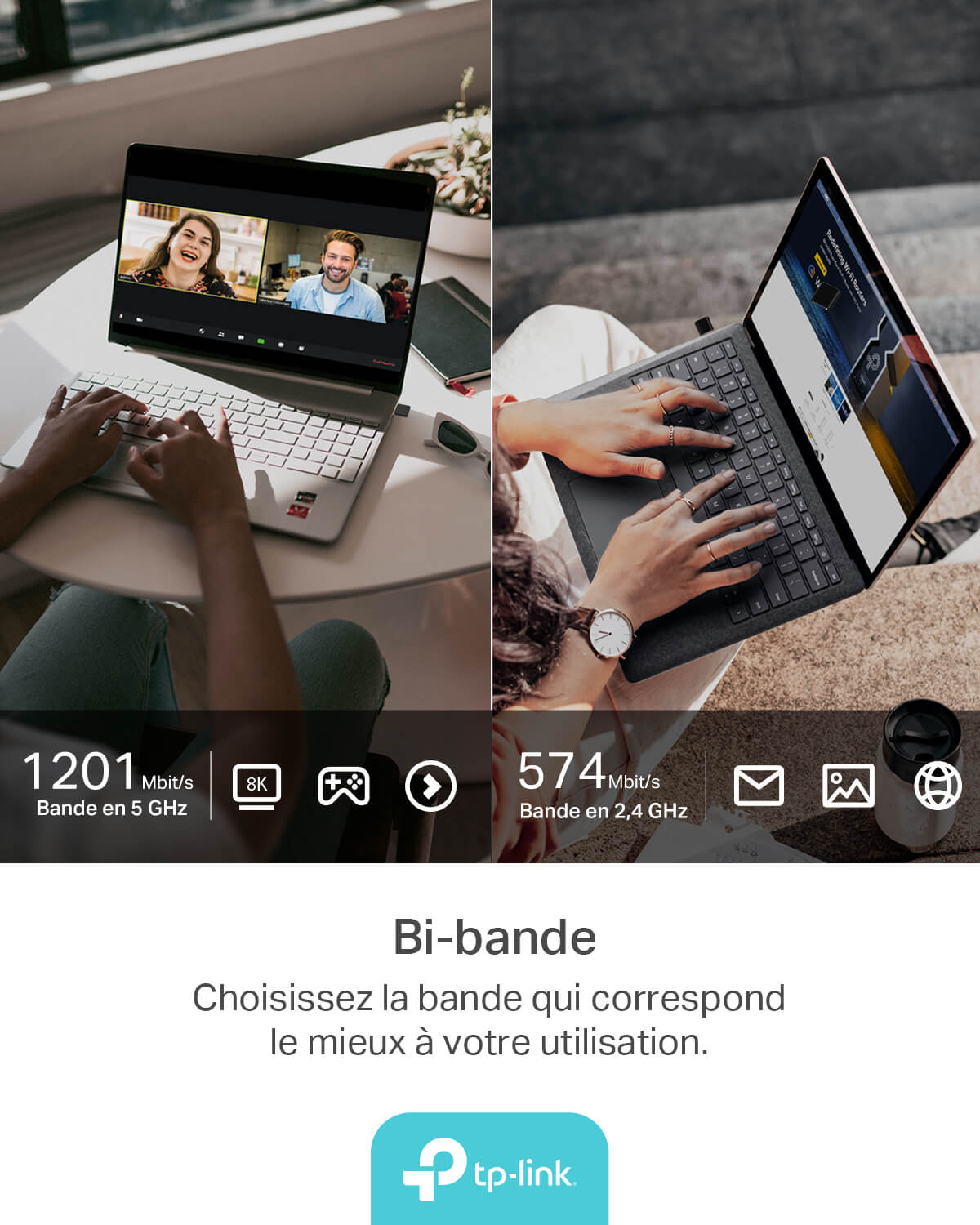 • Double bande 2,4 GHz et 5 GHz – Choisissez la bande la plus adaptée à vos besoins pour une connexion optimale, que ce soit pour le gaming, le streaming ou le télétravail.