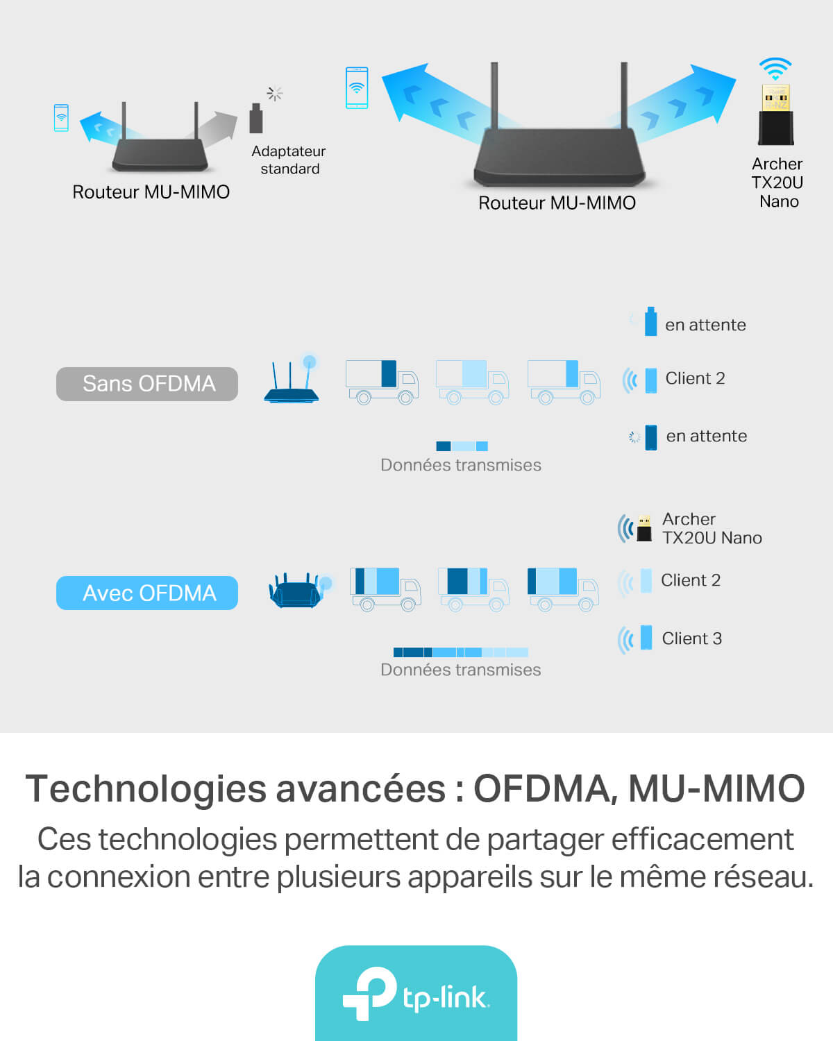 • Technologies OFDMA et MU-MIMO pour une connexion multi-appareils fluide – Optimisez votre réseau en connectant plusieurs appareils simultanément, sans perte de performance, même en usage intensif.