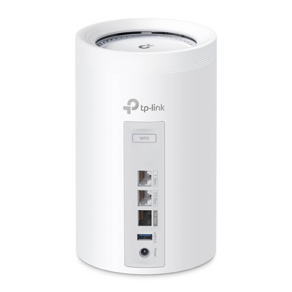 Wi‑Fi 7 tri‑bande (2,4 / 5 / 6 GHz) avec MLO, débit agrégé 14 000 Mbps, avec 4 antennes internes; 3 ports Ethernet autosensing par unité (1G, 2,5G, 10G) + 1 port USB 3.0; sécurité WPA3, MU‑MIMO, support VPN; LEDs de statut multicolores; gestion via application Deco avec IA, contrôle parental, réseau invité; compatible Alexa et Google Assistant.