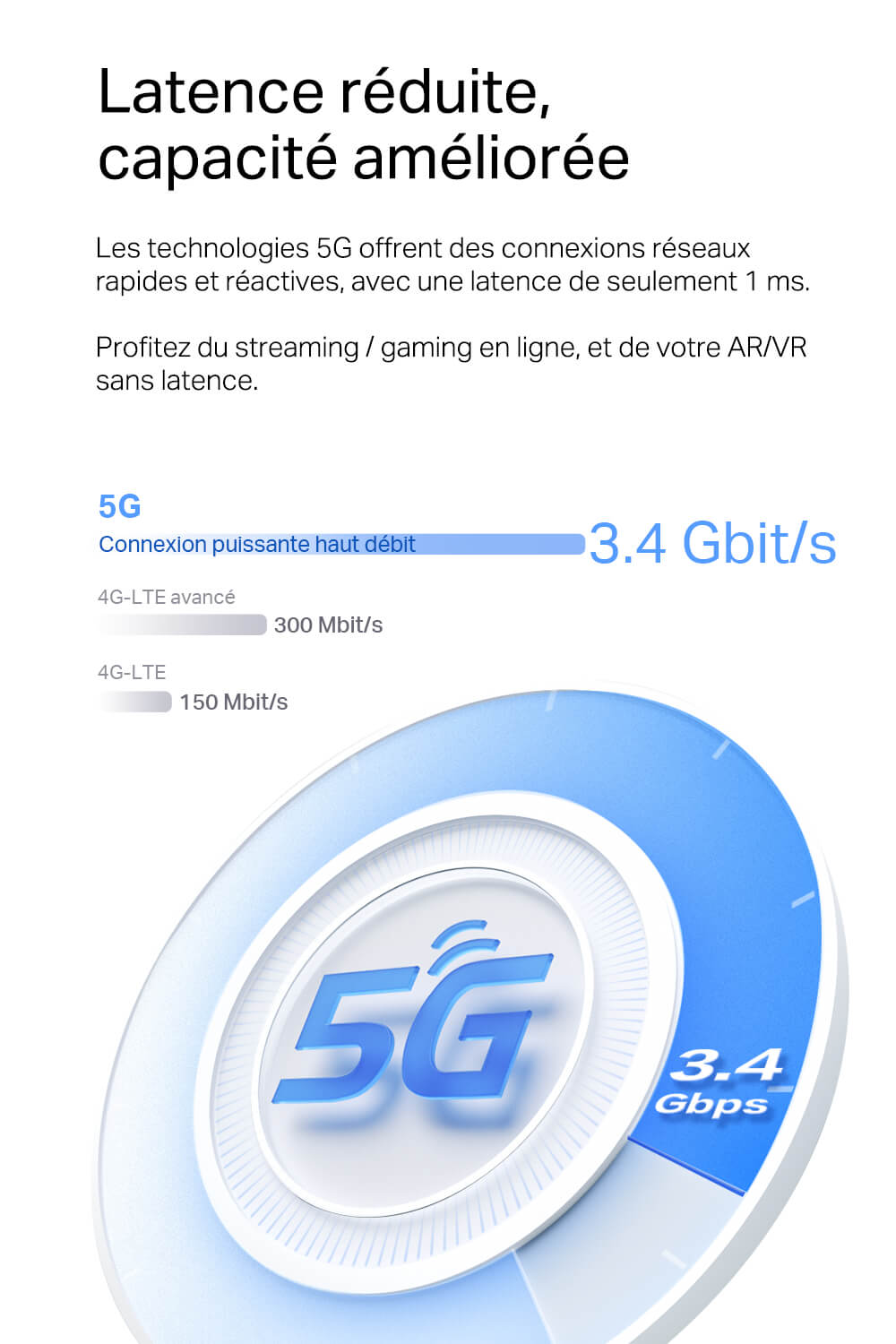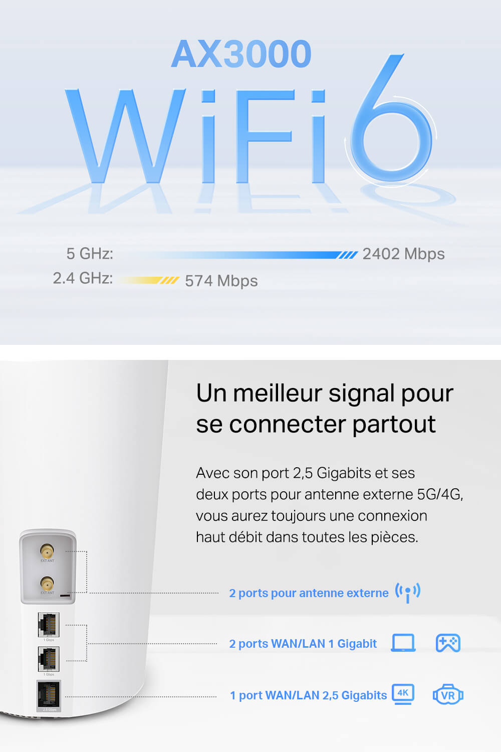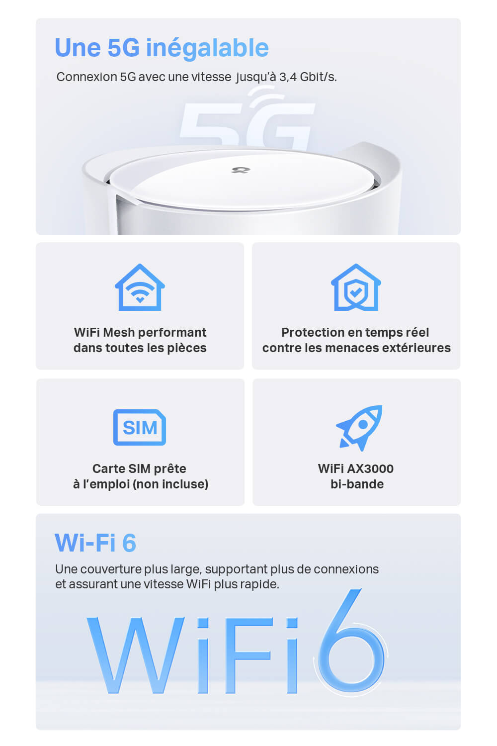 Puissance 5G et Wi‑Fi 6 réunies Faites passer votre Internet domestique à un niveau supérieur avec le TP‑Link Deco X3000‑5G (AX3000). Ce routeur mesh bi‑bande intègre un modem 5G (Sub‑6 GHz) pour des vitesses cellulaires jusqu’à 3,4 Gbit/s, et délivre un Wi‑Fi 6 jusqu’à 3000 Mbps (2402 Mbps en 5 GHz + 574 Mbps en 2,4 GHz). Avec son port 2,5G auto‑détectable et ses 2 ports Gigabit, vous combinez performance réseau et flexibilité pour l’Internet, le gaming en 4K, le streaming en 4K et le télétravail.