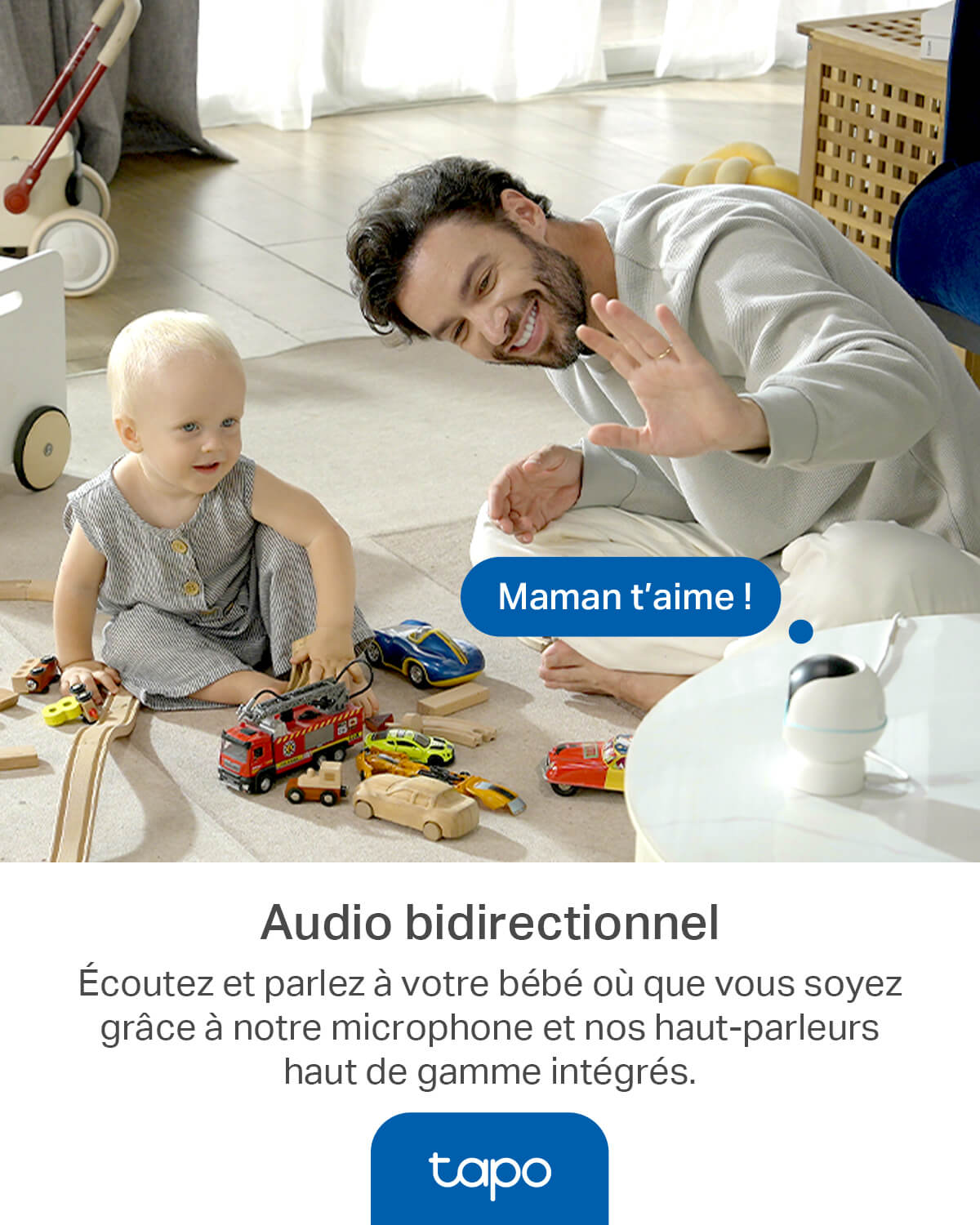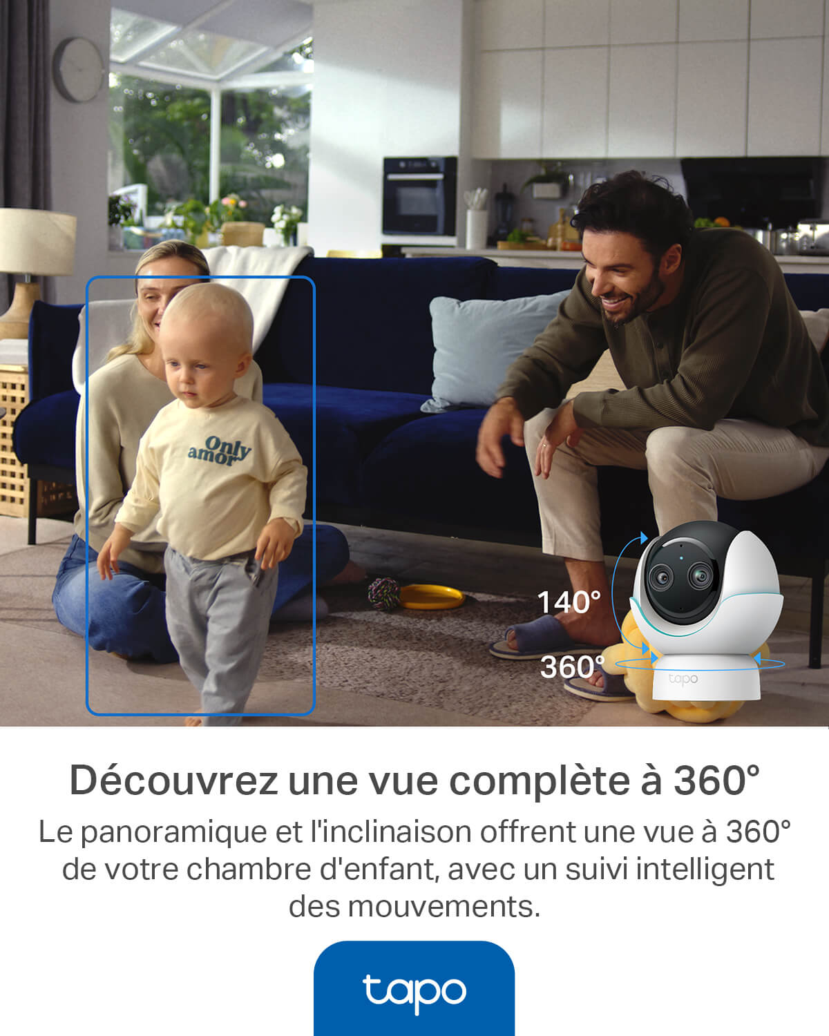 Grâce à son système motorisé de panoramique et d'inclinaison, la Tapo C840 suit chaque mouvement de votre bébé. Sa rotation à 360° assure une couverture totale de la pièce, vous permettant de garder un œil attentif sur votre enfant à tout moment.
