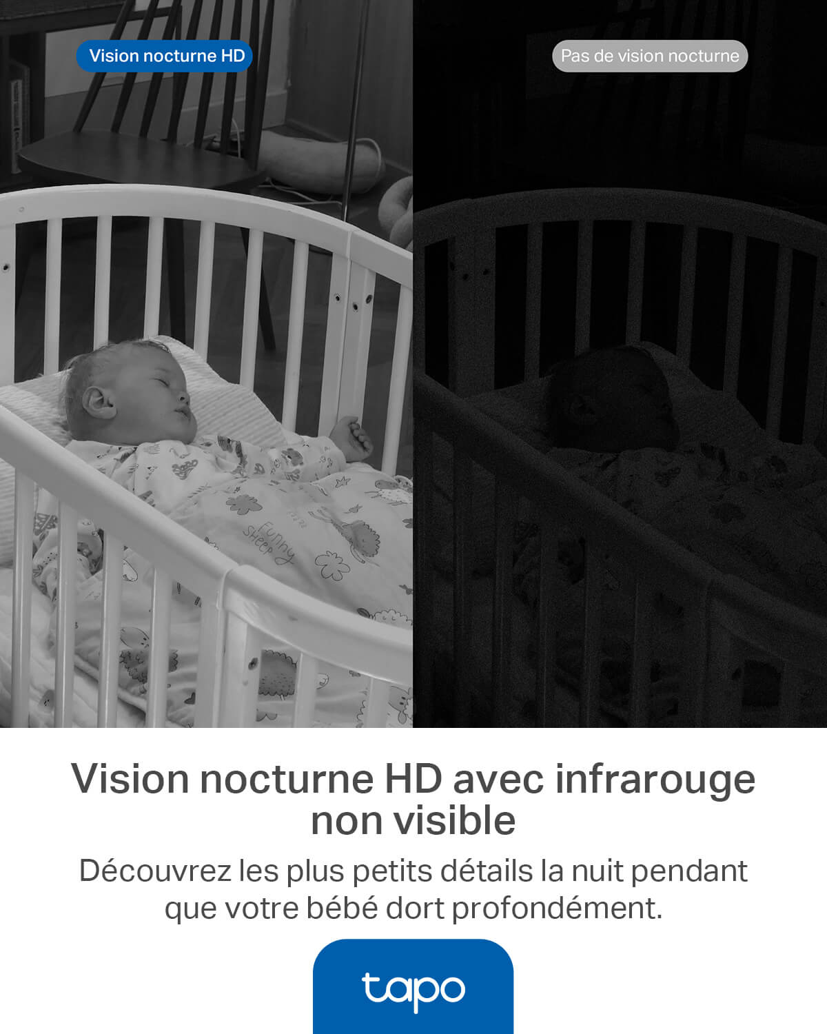 La caméra utilise des infrarouges invisibles pour une vision nocturne HD claire sans perturber le sommeil de bébé. -