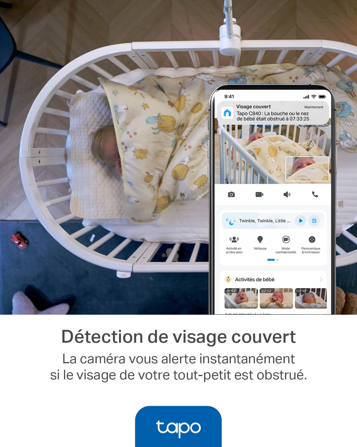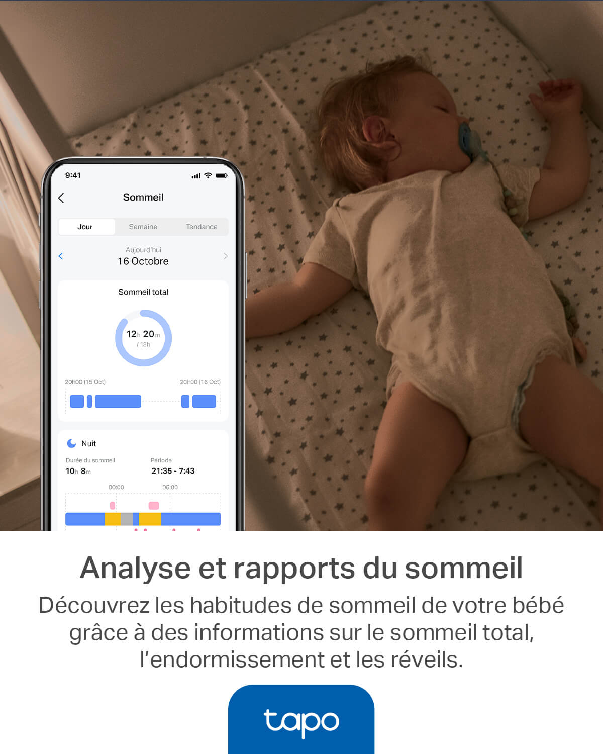 L'IA intégrée à la Tapo C840 va au-delà de la simple surveillance. Elle détecte les pleurs, les visages couverts, les retournements et les réveils, vous alertant immédiatement. De plus, son analyse du sommeil vous aide à comprendre les habitudes nocturnes de votre bébé pour un meilleur suivi de son développement.