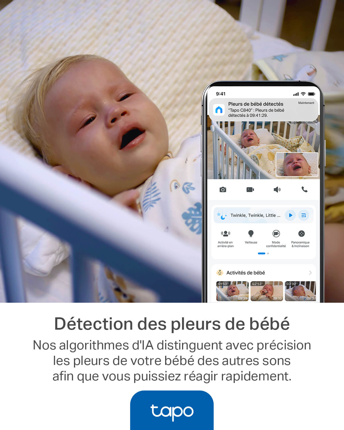 L'IA intégrée analyse les sons et vous alerte immédiatement lorsqu'elle détecte des pleurs, vous permettant de réagir rapidement. -
