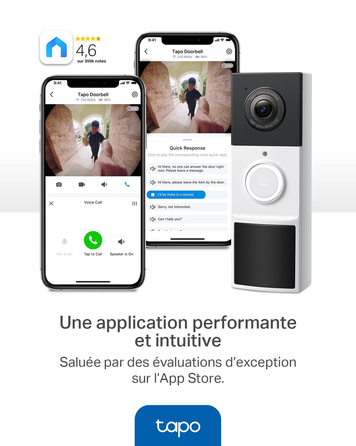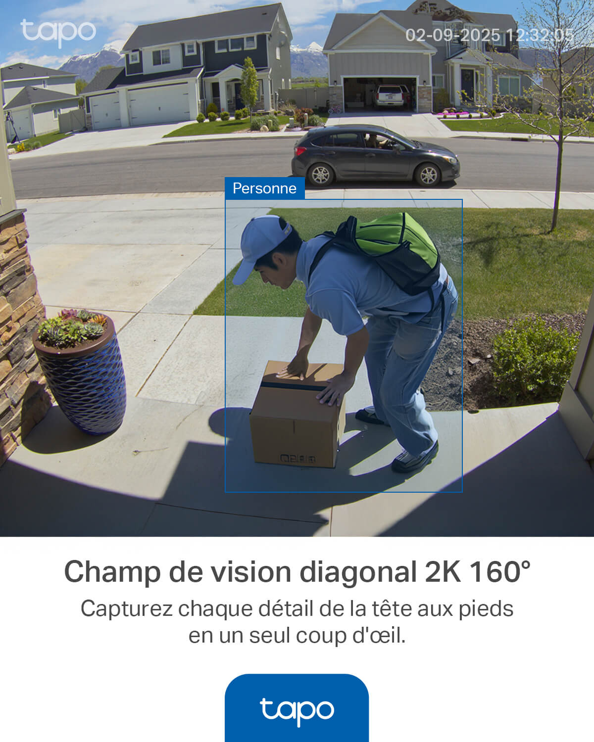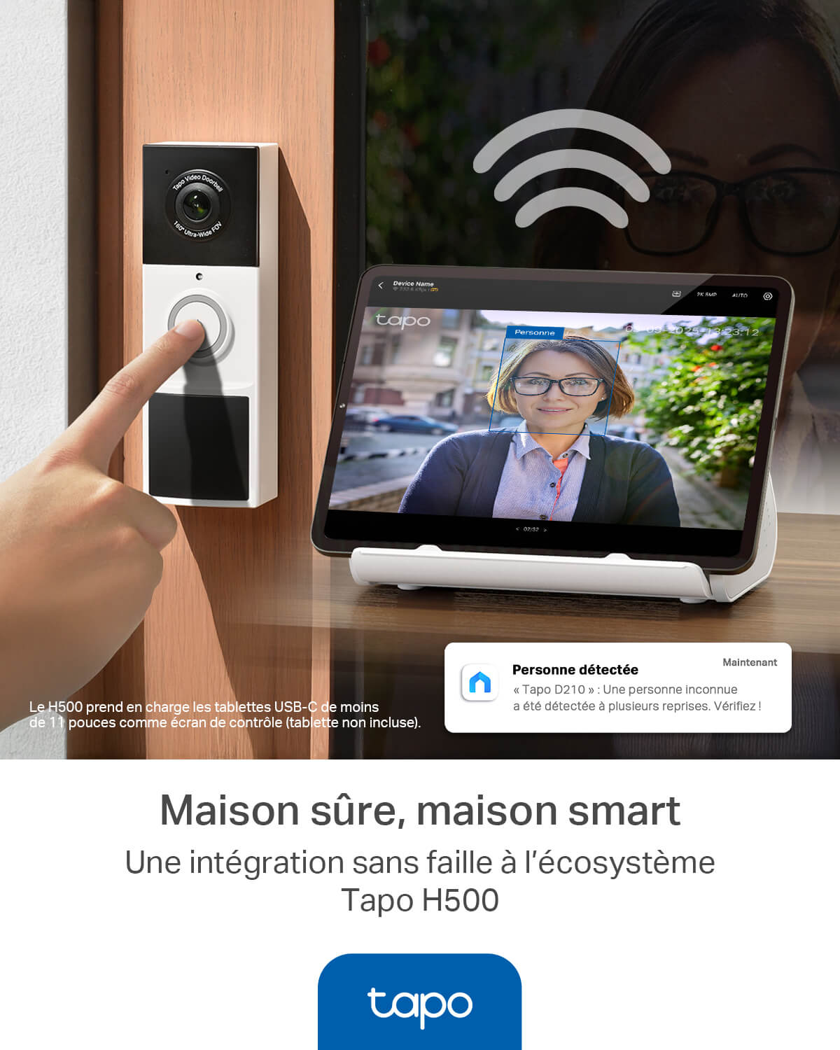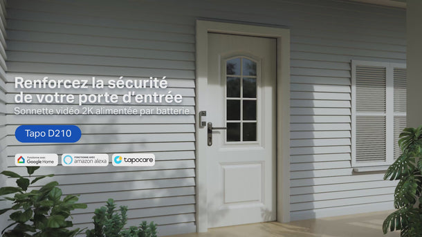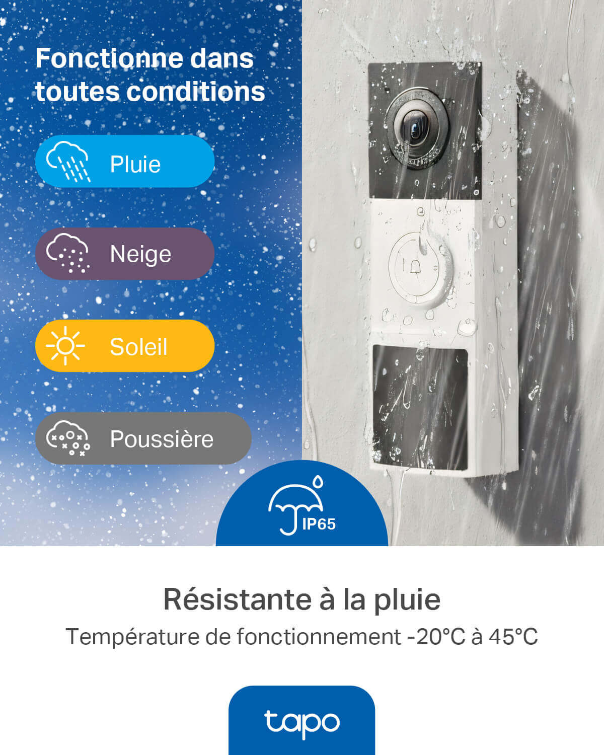 La Sonnette Vidéo Connectée 2K avec Carillon - Tapo D210 est une sonnette intelligente sans fil, alimentée par une batterie rechargeable de 6400mAh offrant jusqu'à 180 jours d'autonomie. Dotée d’une caméra 2K (2304 x 1296 pixels, 3MP) avec un large champ de vision de 160° (135° horizontal, 109° vertical), elle capture clairement les visiteurs de la tête aux pieds, de jour comme de nuit grâce à la vision nocturne couleur et infrarouge intégrée. Résistante aux intempéries (IP65), elle convient parfaitement à un usage extérieur. Son système d’IA détecte les personnes et zones d’activité personnalisées sans frais d’abonnement, envoyant des notifications instantanées. Les enregistrements sont stockés localement sur carte microSD (jusqu’à 512 Go) ou via le cloud (abonnement). Elle inclut un carillon sans fil pour l'intérieur et permet une communication bidirectionnelle grâce à son micro et haut-parleur intégrés. Compatible avec Alexa et Google Assistant, la Tapo D210 s’installe facilement et offre une surveillance sécurisée et pratique à la maison.