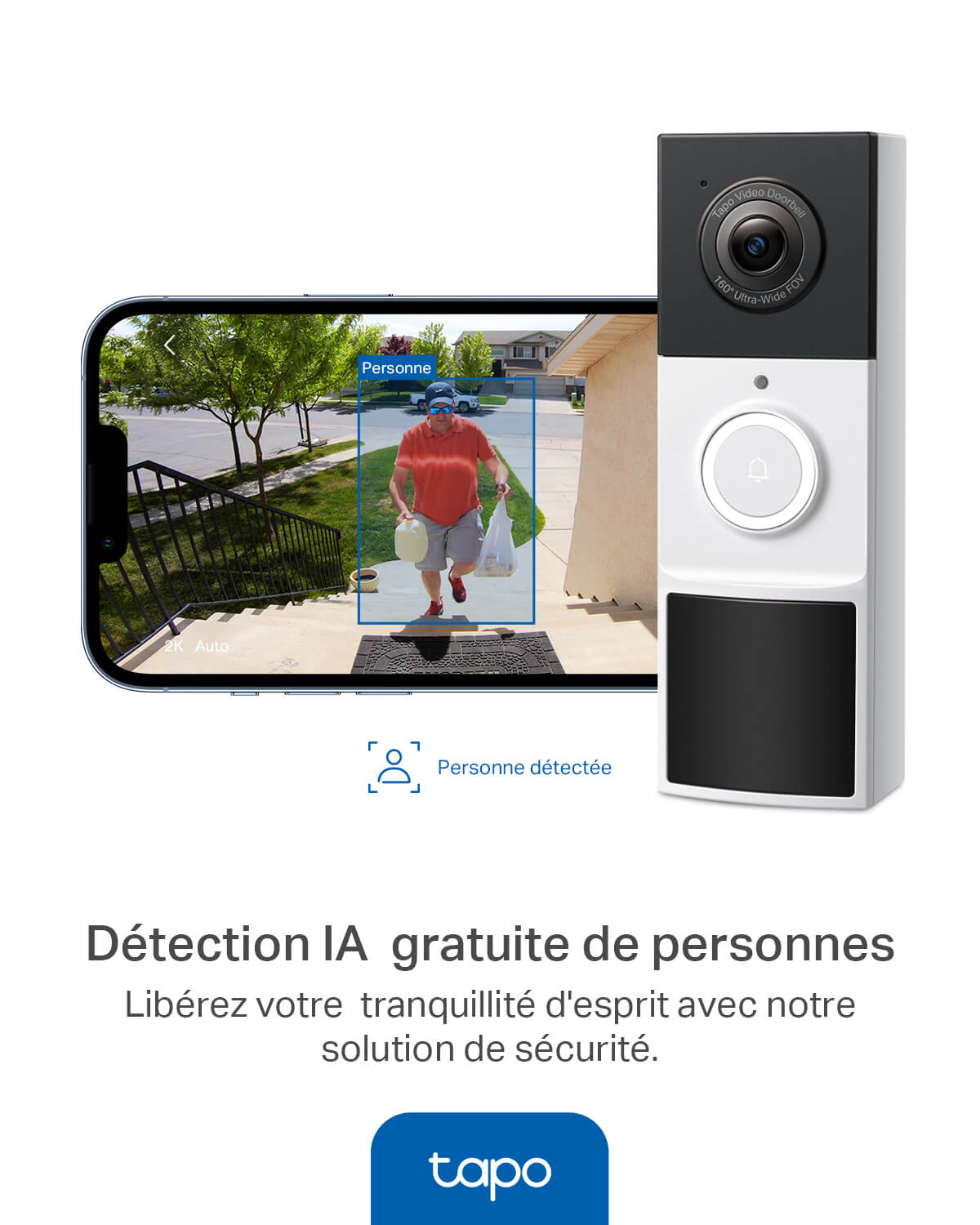 La Tapo D210 va au-delà d'une simple sonnette. Son système d'IA détecte les personnes et surveille les zones que vous définissez, sans frais d'abonnement. Recevez des alertes instantanées sur votre smartphone et communiquez en temps réel grâce à l'audio bidirectionnel. Que vous soyez en télétravail ou en déplacement, restez connecté à votre domicile.