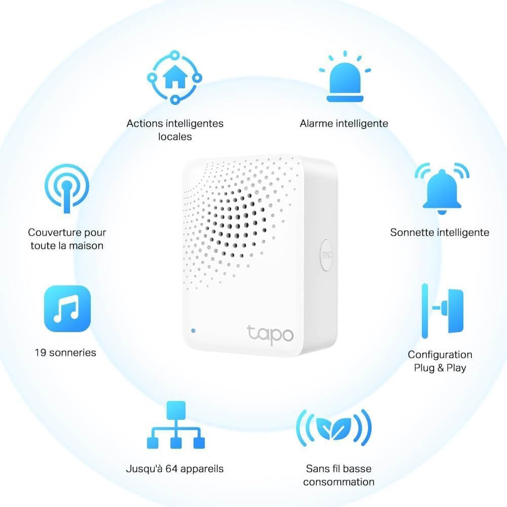 Spécifications techniques principales : - Connectivité : Wi-Fi 2,4 GHz et protocole propriétaire Tapo (868/922 MHz) - Capacité de gestion : jusqu'à 64 appareils Tapo - Sécurité : alarme intégrée de 90 dB - Fonctionnalités sonores : 19 sonneries disponibles pour le carillon - Alimentation : secteur 100-240V AC, 50/60 Hz - Dimensions compactes : 72 x 62,5 x 51 mm - Compatibilité : application Tapo pour iOS et Android