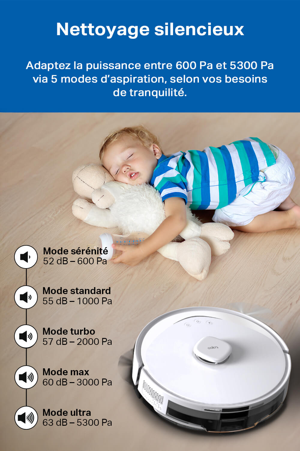 Principales spécifications techniques : - Puissance d'aspiration : 5300 Pa - Autonomie : jusqu'à 150 minutes - Capacité batterie : 2600 mAh - Réservoirs eau et poussière : 300 ml chacun - Navigation : système LiDAR et IMU - Niveau sonore : à partir de 52 dB - Compatibilité : Google Assistant et Amazon Alexa - Filtration : HEPA (H11) - Surfaces adaptées : moquette, parquet, carrelage - Dimensions : 33 x 33 x 10 cm