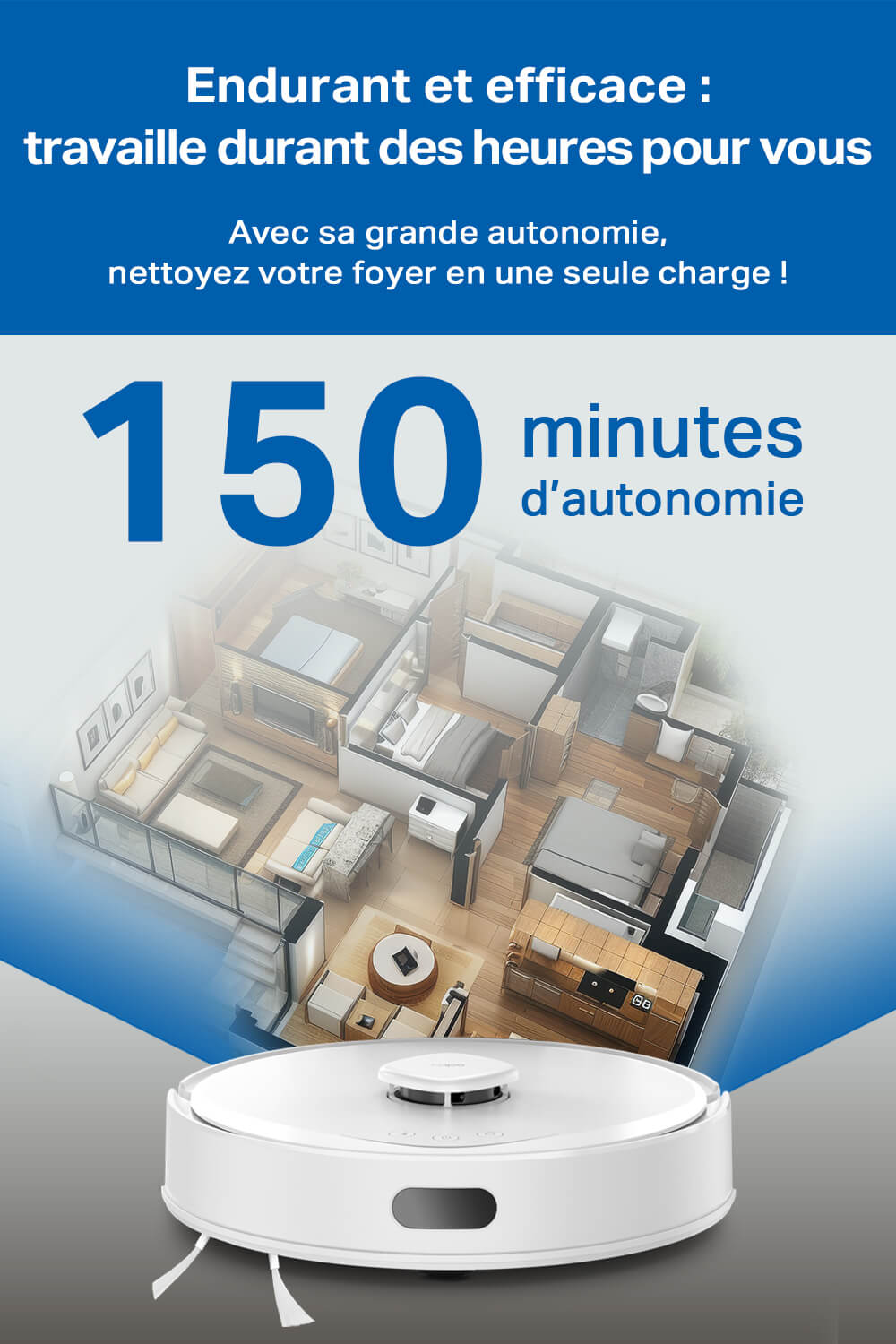 L'autonomie peut atteindre jusqu'à 150 minutes avec une batterie de 2600 mAh, permettant un nettoyage prolongé sans interruption. -