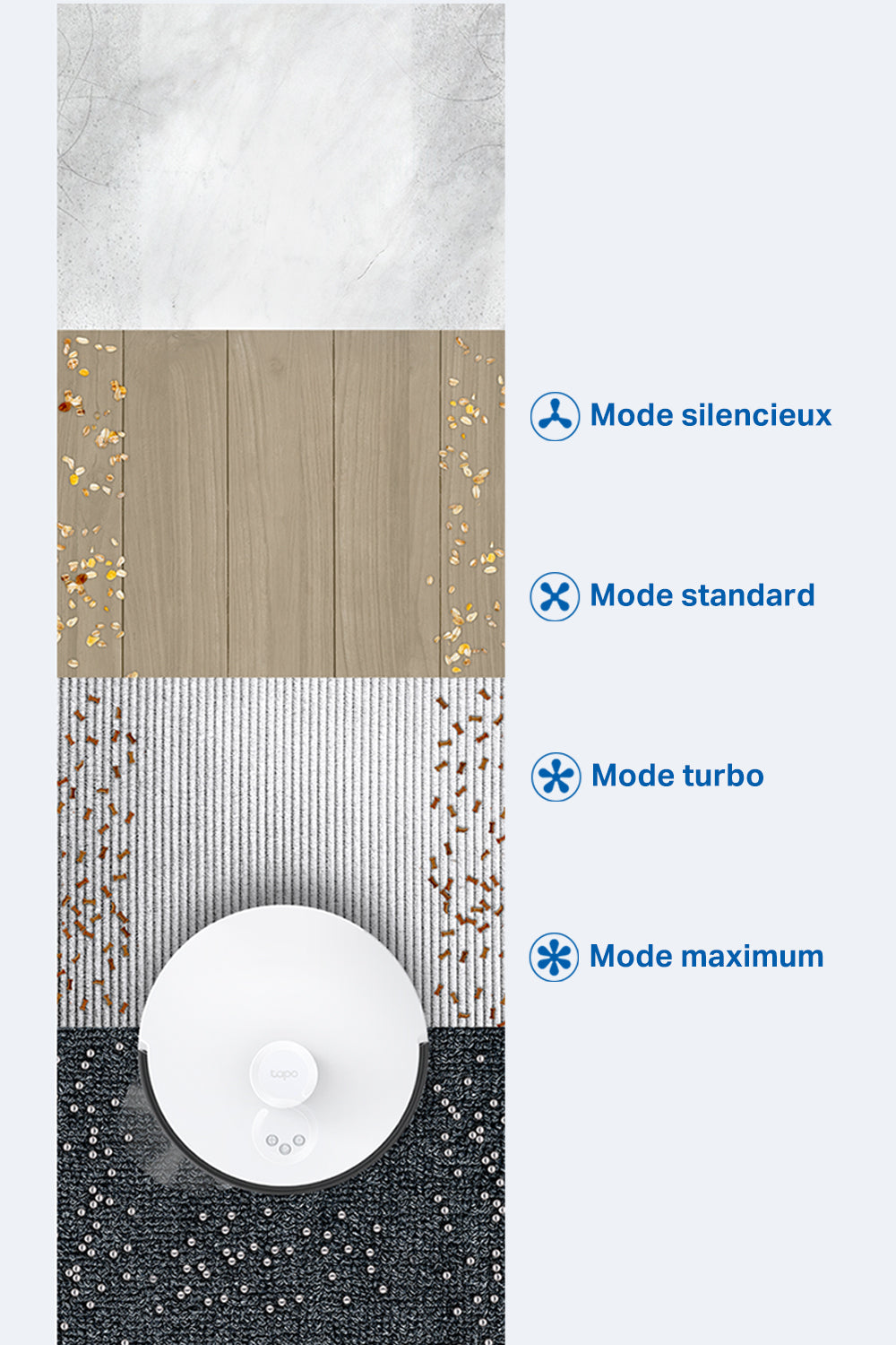 Le Tapo RV30C Mop se distingue par sa puissance d'aspiration remarquable de 4200 Pa. Cette caractéristique lui permet de s'attaquer efficacement à la saleté sur tous types de surfaces, des sols durs aux tapis épais. Avec quatre niveaux d'aspiration ajustables, vous pouvez adapter la puissance en fonction de vos besoins spécifiques, assurant un nettoyage en profondeur tout en préservant vos surfaces délicates.