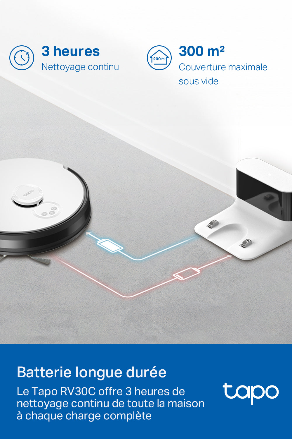 Doté d'une batterie lithium-ion de 3200 mAh, le Tapo RV30C Mop offre une autonomie impressionnante pouvant atteindre 3 heures de fonctionnement continu. Cette capacité lui permet de couvrir de grandes surfaces sans interruption. De plus, sa fonction de recharge et reprise automatique assure que le nettoyage se poursuit là où il s'était arrêté, garantissant ainsi un nettoyage complet de votre domicile, même pour les espaces les plus vastes.