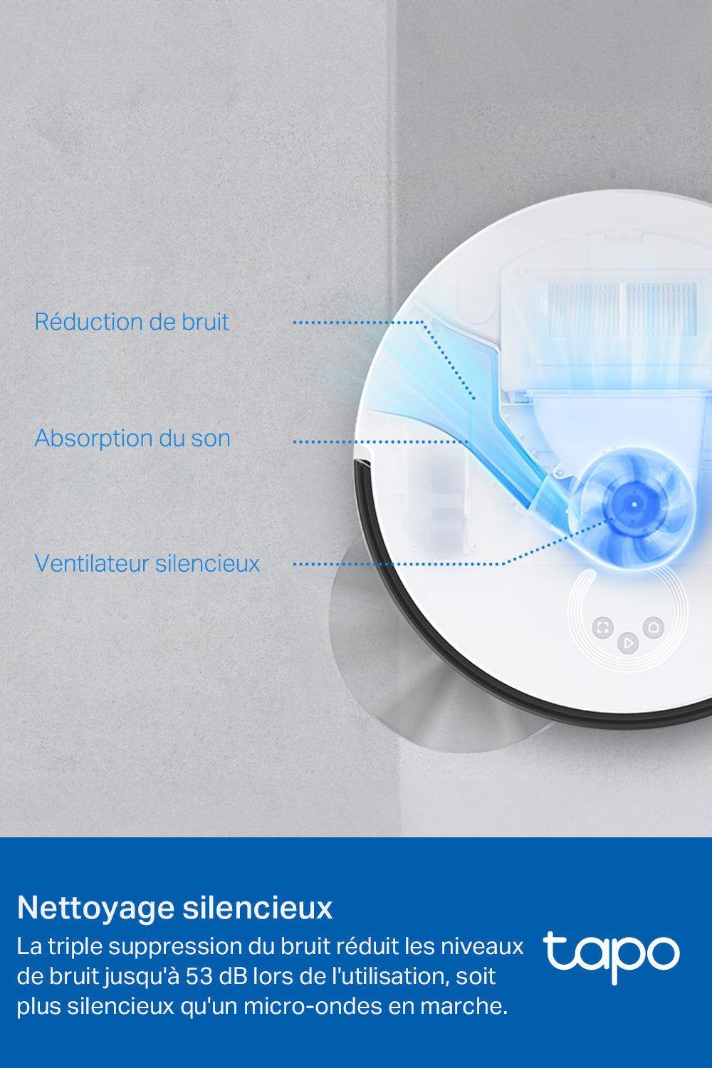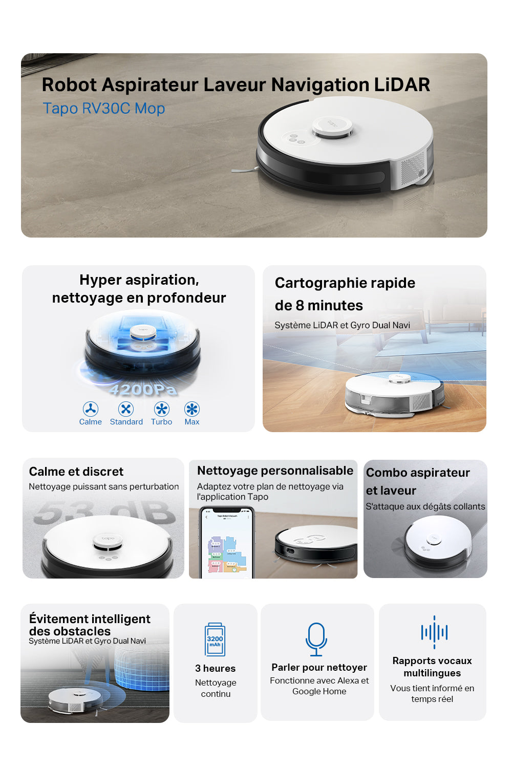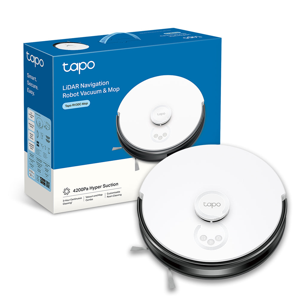 Le Tapo RV30C Mop est un aspirateur robot laveur performant de la marque Tapo, conçu pour nettoyer automatiquement vos sols grâce à une puissance d’aspiration de 4200 Pa et un système de navigation LiDAR et gyroscope pour un mapping précis à 360°. Il aspire et lave tous types de sols (durs, tapis, moquettes) avec quatre modes d’aspiration ajustables et un réservoir d’eau de 300 ml réglable sur trois niveaux, idéal pour un ménage sur-mesure. Son filtre HEPA capture 99,9 % des allergènes jusqu’à 0,3 micron. L’appareil est doté de fonctionnalités intelligentes : détection automatique des tapis, reprise du nettoyage après recharge automatique, programmation personnalisée via l’application Tapo et compatibilité avec les assistants vocaux. Sa batterie de 3200 mAh offre jusqu’à 3 heures d’autonomie. Accessoires inclus : base de recharge, accessoires de lavage et entretien. Idéal pour maintenir des sols propres sans effort.