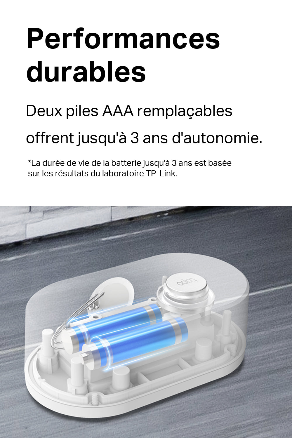 Avec les deux piles AAA incluses, le capteur offre une autonomie pouvant aller jusqu'à 3 ans en utilisation normale.
