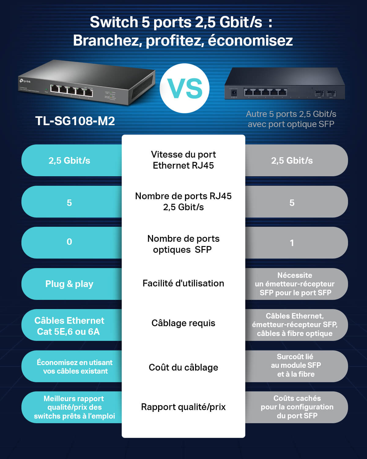 Avec ses 5 ports RJ45 supportant jusqu'à 2,5 Gbps chacun, ce switch TP-Link assure une connectivité ultra-rapide pour tous vos appareils. Parfait pour les transferts de fichiers volumineux, le streaming 4K et les jeux en ligne sans latence.