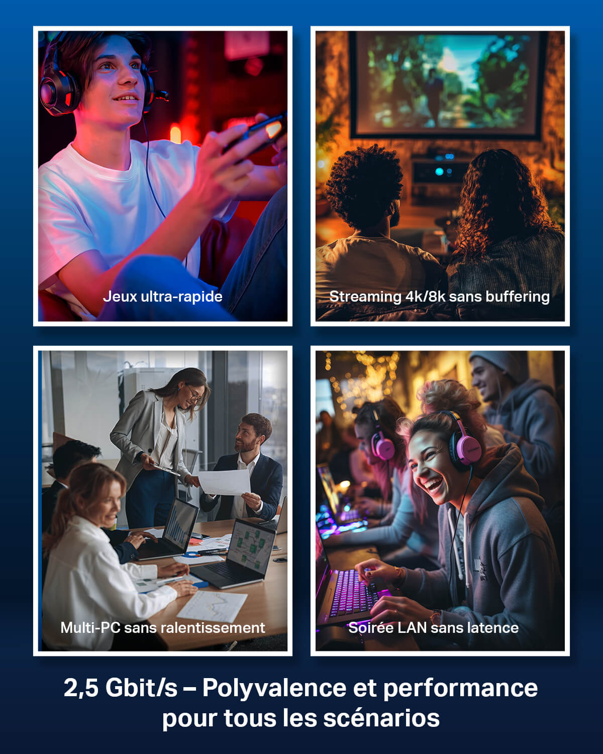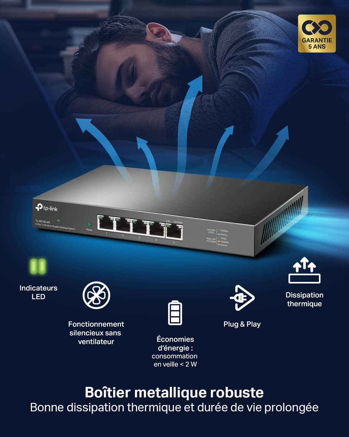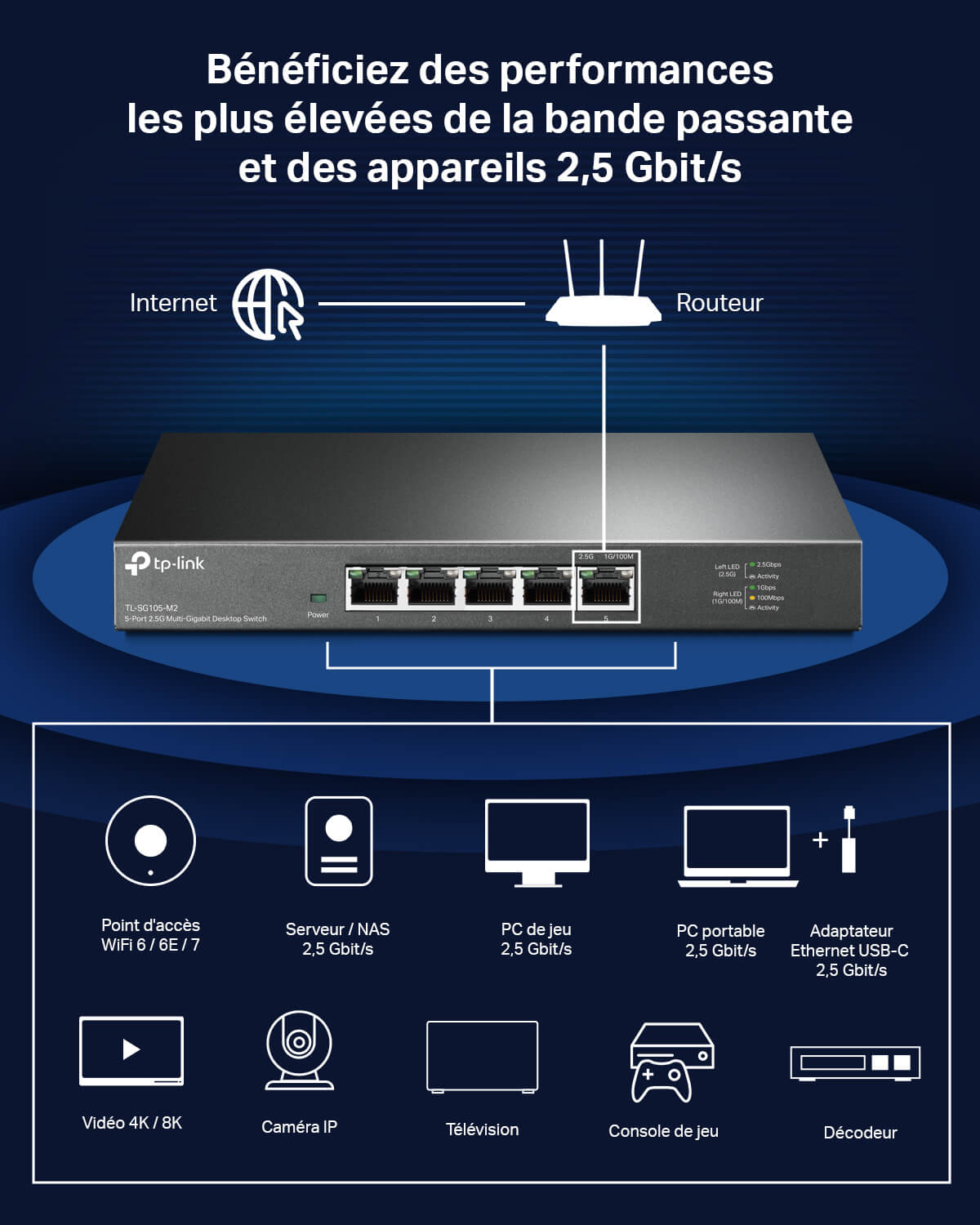 - Vitesse multi-gigabit – 5 ports RJ45 supportant des débits jusqu'à 2,5 Gbps pour des transferts ultra-rapides
