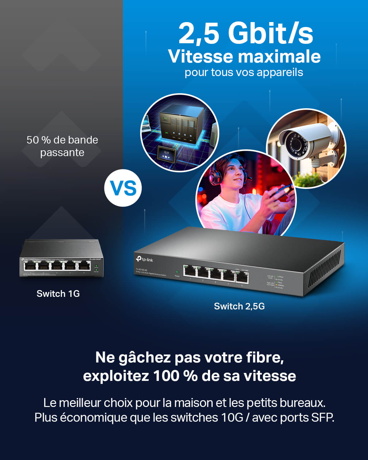 Chaque port du TL-SG105-M2 prend en charge des vitesses jusqu'à 2,5 Gbps, offrant une connectivité réseau haute performance. -